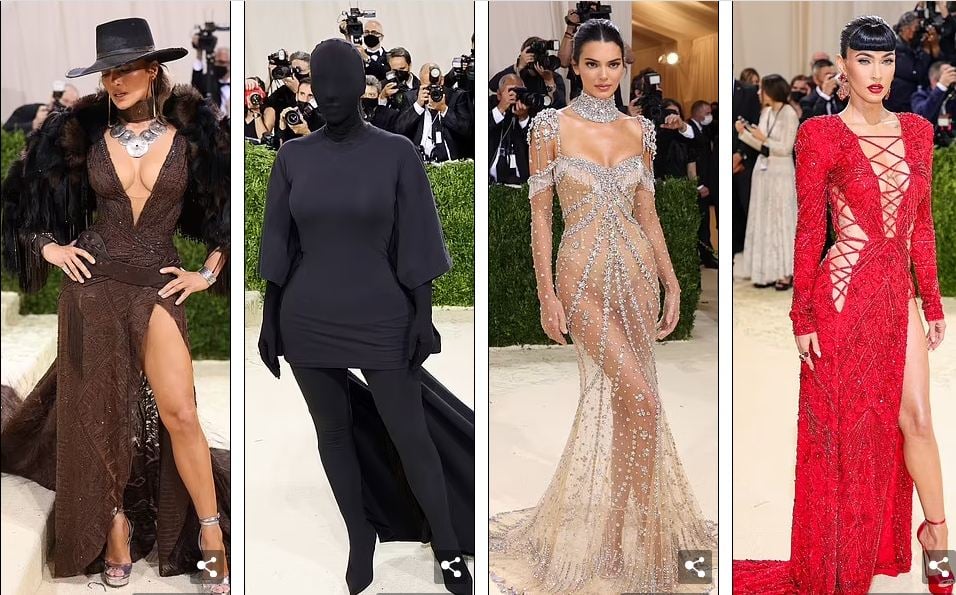 وأيضًا ارتدت نجمة تليفزيون الواقع كيم كارداشيان إطلالة هى الأغرب على الإطلاق حين ظهرت ب فستانا ضيقا للغاية، واعترفت بأنها اضطرت إلى أخذ دروس في التنفس مسبقًا، وأيضًا أثارت الجدل بشكل كبير بإطلالة سوداء غطتها بالكامل حتى وجهها… وغيرها من الإطلالات الكثيرة.