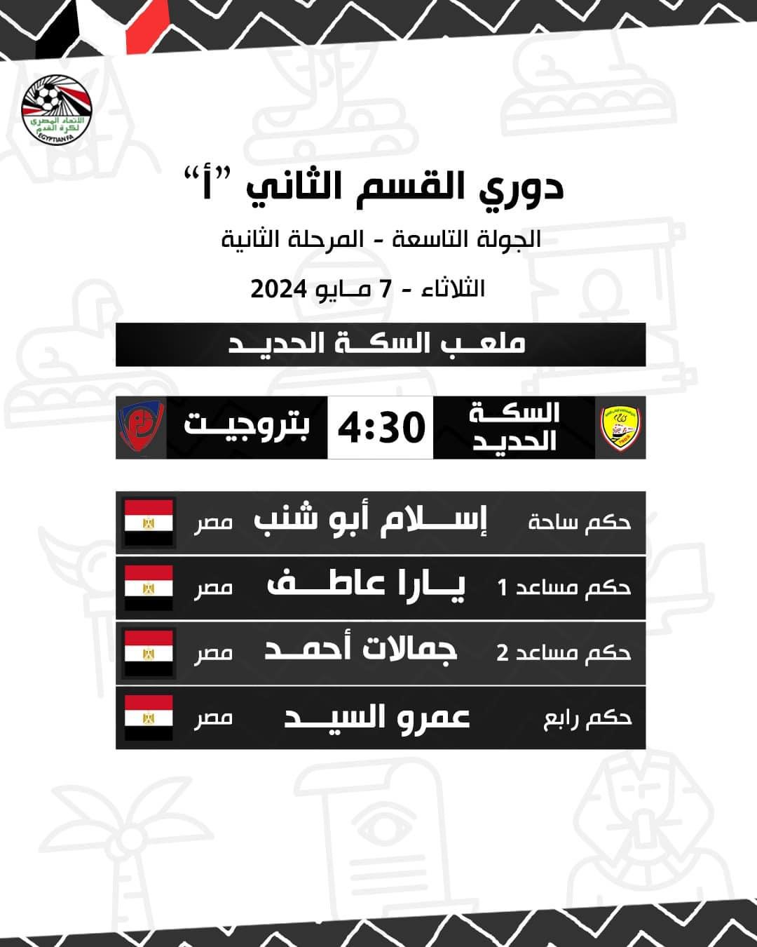 دوري المحترفين، أعلن اتحاد الكرة المصري عن حكم مباراة السكة الحديد أمام بتروجيت المقرر لها غدا الثلاثاء ضمن منافسات الجولة الأخيرة من مجموعة الصعود في دوري المحترفين.
