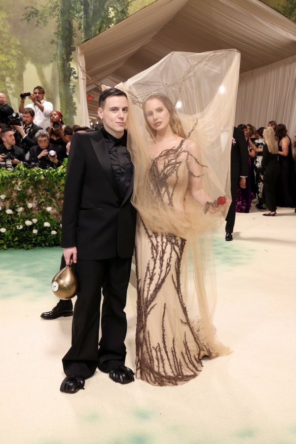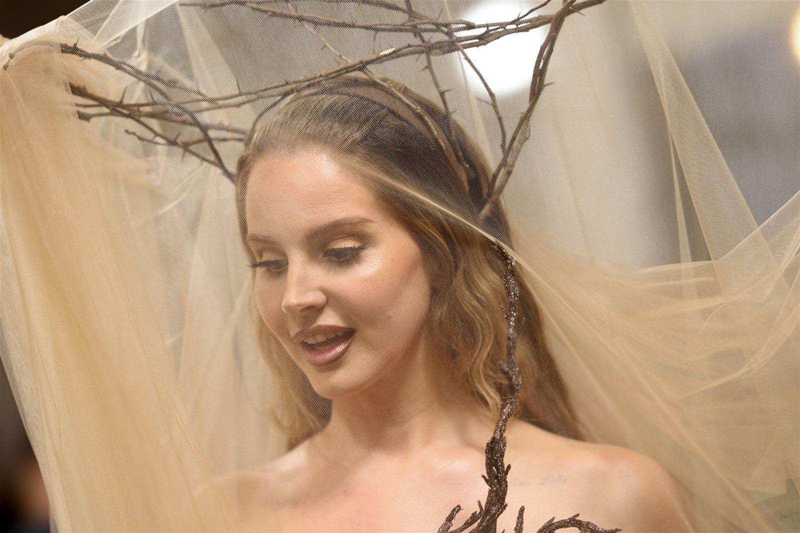 وتألقت النجمة لانا دل راي بفستان باللون البيج، والذي تميز بفروع الأشجار التي ارتدتها كتاج وفوقها وشاح شفاف.