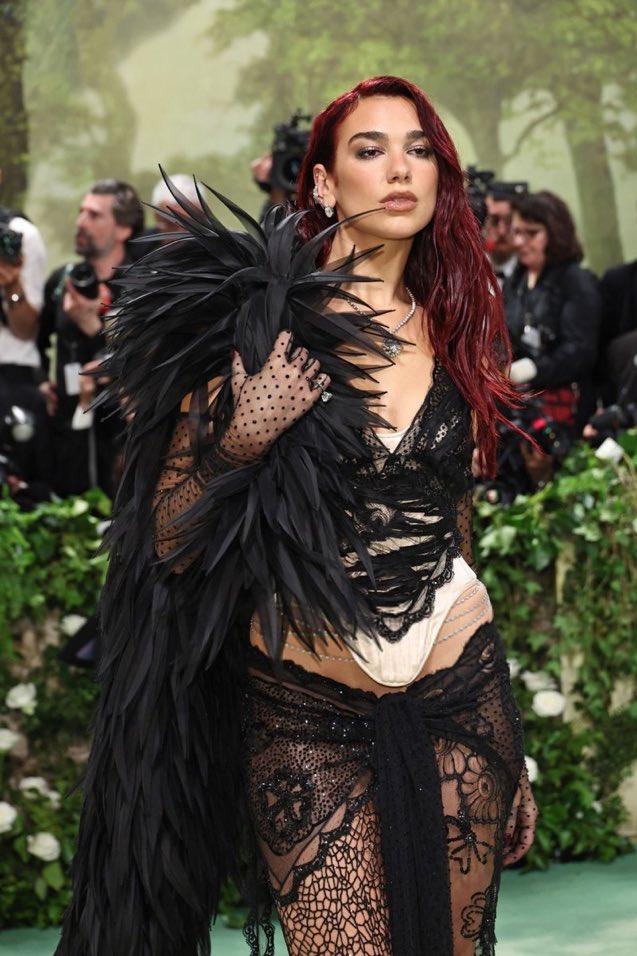 تألقت المغنية العالمية دوا ليبا بشعر أحمر وزي أسود وأبيض ومعطف يشبه الريش، والذي أثار جدلًا بين متابعي الميت جالا عن ما إن كان الفستان مناسبا لموضوع هذا العام أم لا.