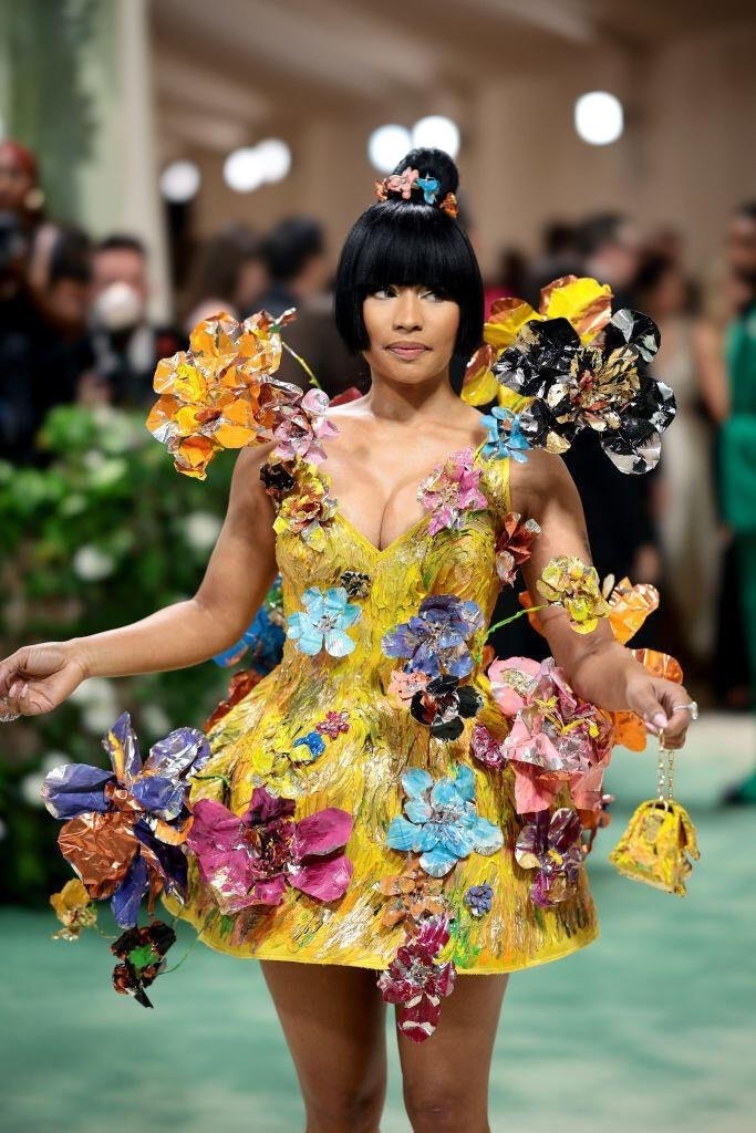 وفاجأت مغنية الراب العالمية نيكي ميناج معجبيها ومتابعي الميت جالا بفستان أصفر من البلاستيك ومزين بورود من نفس الخامة، والذي أثار جدلًا بين الجمهور، حيث أعجبت الفكرة العديد من الأشخاص بينما رأى آخرون أنها تشبه “الزهرية”.