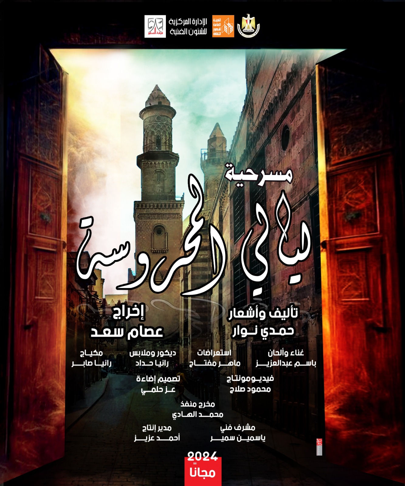 "ليالي المحروسة" بطولة فرقة السامر المسرحية، تأليف وأشعار حمدي نوار، وإخراج عصام سعد، غناء وألحان باسم عبد العزيز، استعراضات ماهر مفتاح، ديكور وملابس رانيا حداد، مكياج رانيا صابر، فيديو ومونتاج محمود صلاح، تصميم إضاءة عز حلمي، مخرج منفذ محمد ممدوح الهادي، مشرف فني ياسمين سمير، مدير إنتاج أحمد عزيز.