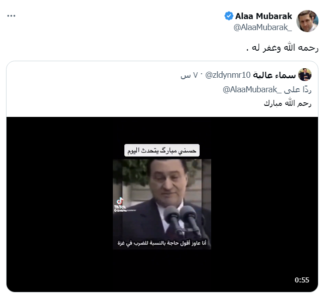 وعلق علاء مبارك على تحليل الرئيس الراحل عن إفشال الاحتلال لمفاوضات الهدنة في غزة، وعدم رغبتهم في إتمام السلام قائلا: "رحمه الله وغفر له."