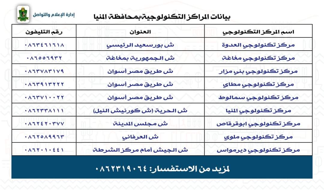 أرقام المراكز التكنولوجية في محافظة المنيا