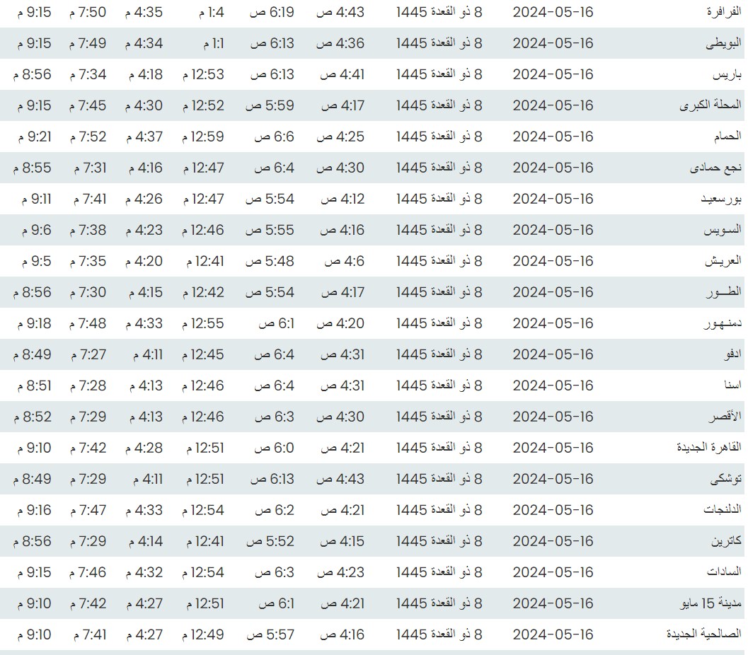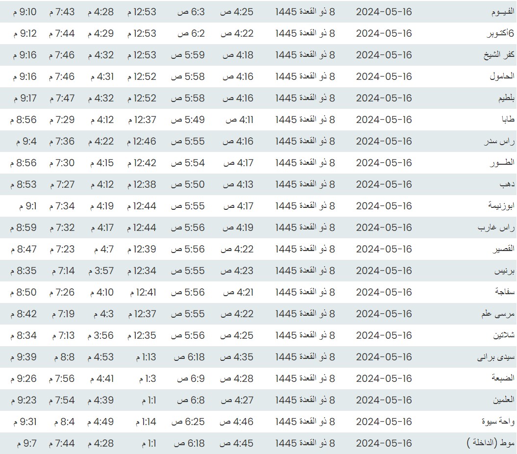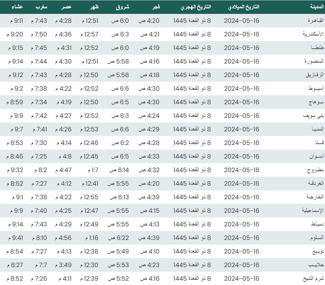 وفيما يلي مواقيت الصلاة، لعدد من مدن ومحافظات الجمهورية من واقع بيانات الهيئة العامة للمساحة