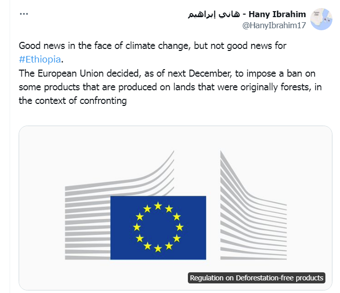 وقال هاني إبراهيم، عبر حسابة على منصة "أكس": "خبر جيد في مواجهة التغير المناخي، لكنه غير جيد على إثيوبيا. الاتحاد الأوروبي قرر من ديسمبر القادم فرض حظر على بعض المنتجات التي يتم إنتاجها في أراضي كانت في الأصل غابات".