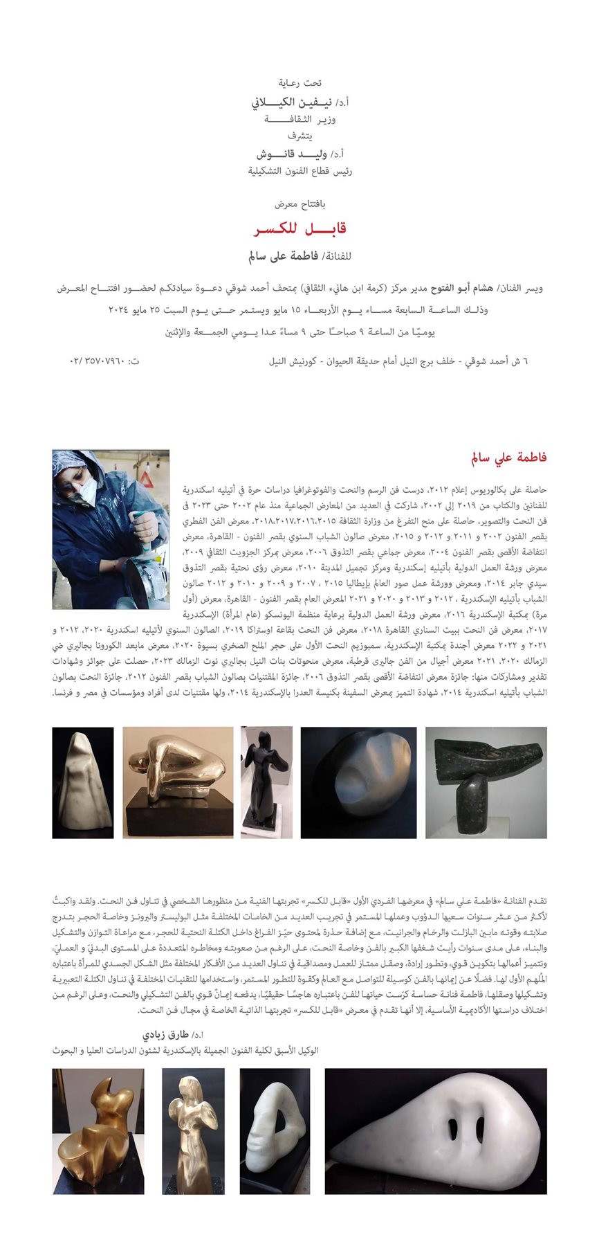 يعد معرض “قابل للكسر” تجربة ذاتية خاصة للفنانة فاطمة علي سالم في فن النحت، فهو المعرض الأول الفردي لها، لذلك اختارت الفنانة أن تجسد تجربتها الفنية من منظور شخصي من خلال الخامات المختلفة مثل البوليستر والبرونز والحجر بأشكاله المختلفة بين البازلت والرخام والجرانيت.