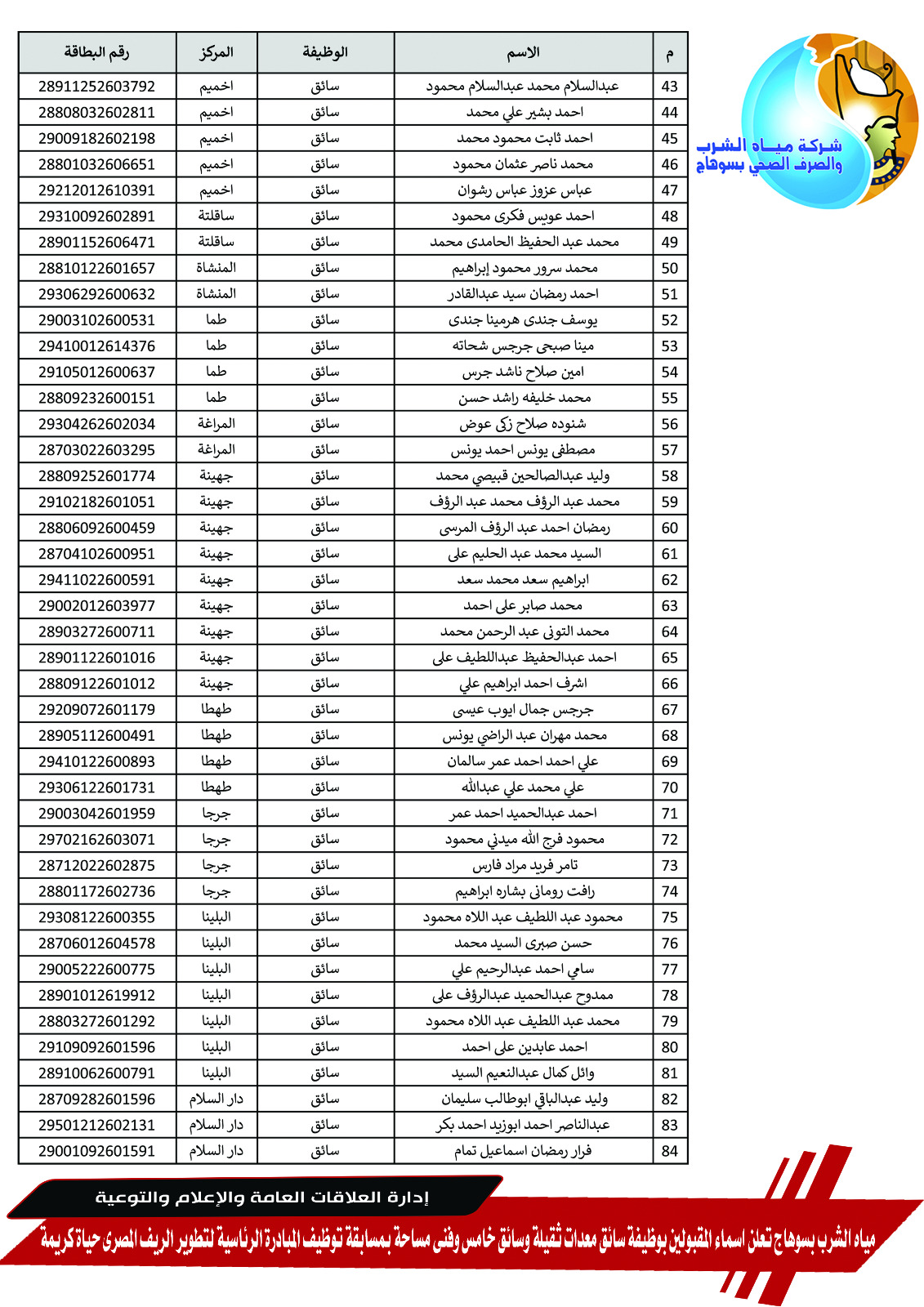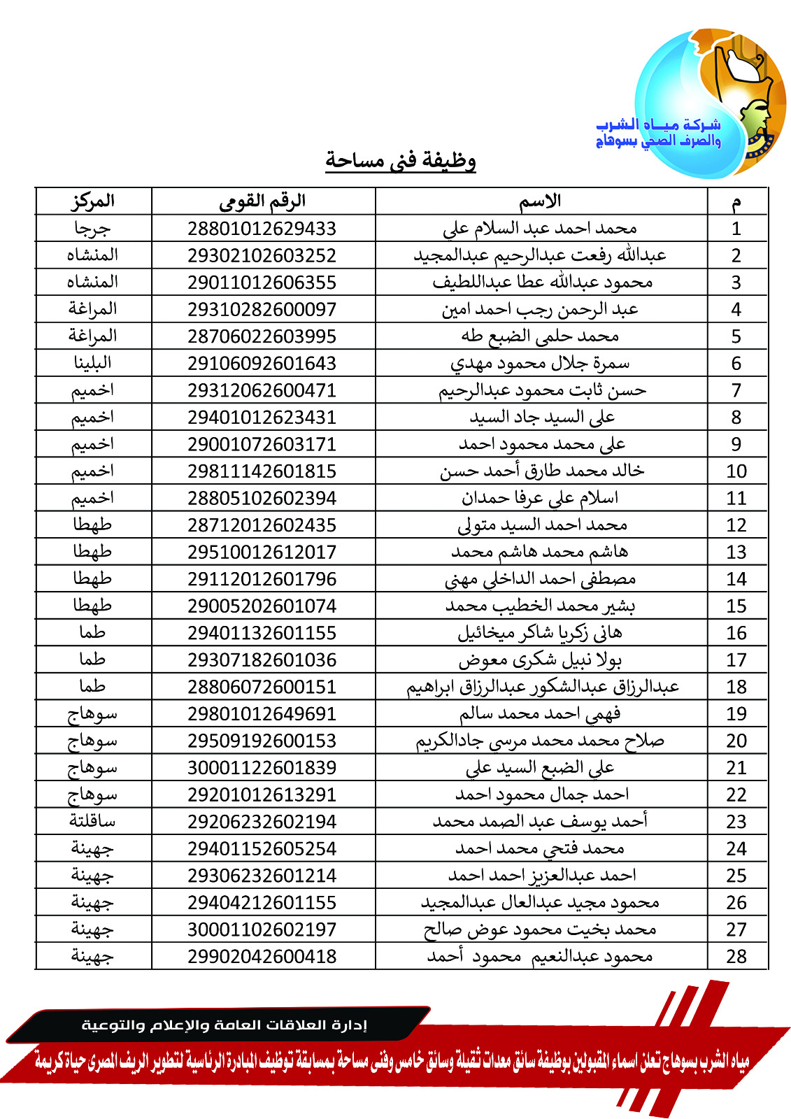 مياه الشرب بسوهاج تعلن أسماء المقبولين بوظائف سائق وفني مساحة