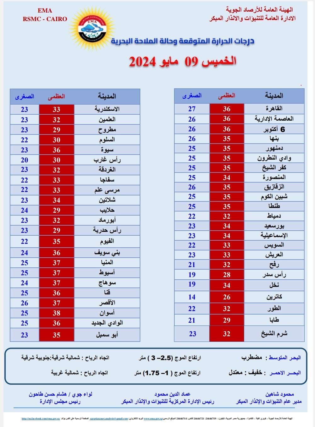 ونشرت هيئة الأرصاد الجوية بيانا بدرجات الحرارة المتوقعة اليوم الخميس، على مدن ومحافظات مصر، وجاء كالتالي: