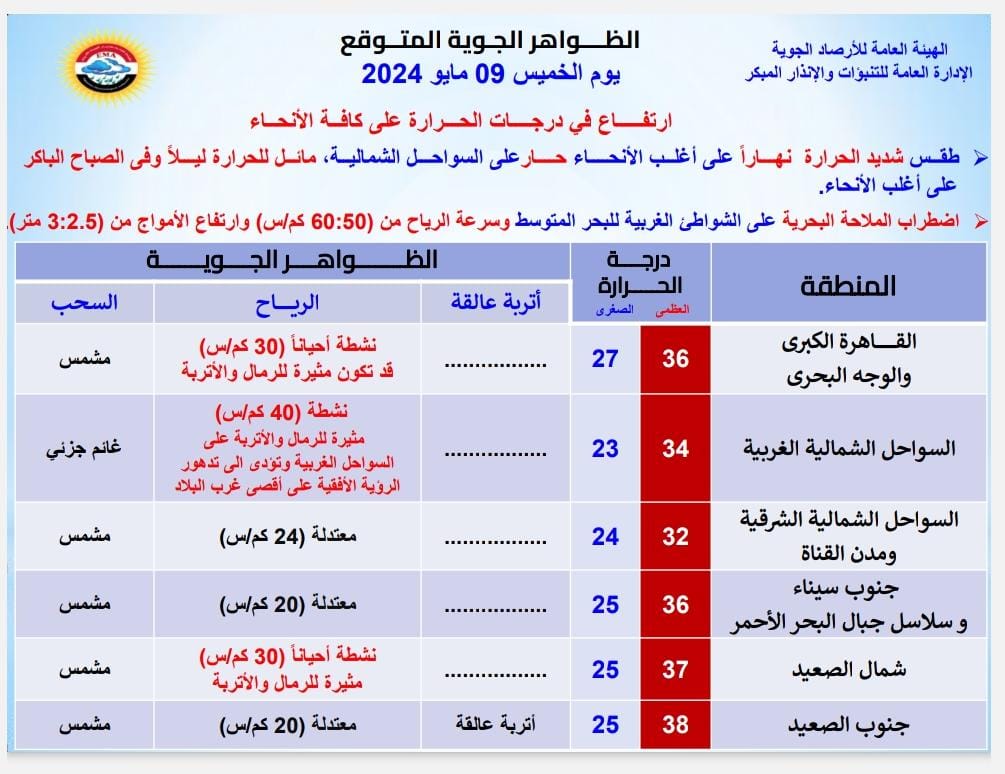 حذرت هيئة الأرصاد الجوية، من حالة الطقس اليوم الخميس 9 - 5 - 2024، مؤكدة تأثر البلاد بكتل هوائية صحراوية تعمل على ارتفاع كبير بدرجات الحرارة.