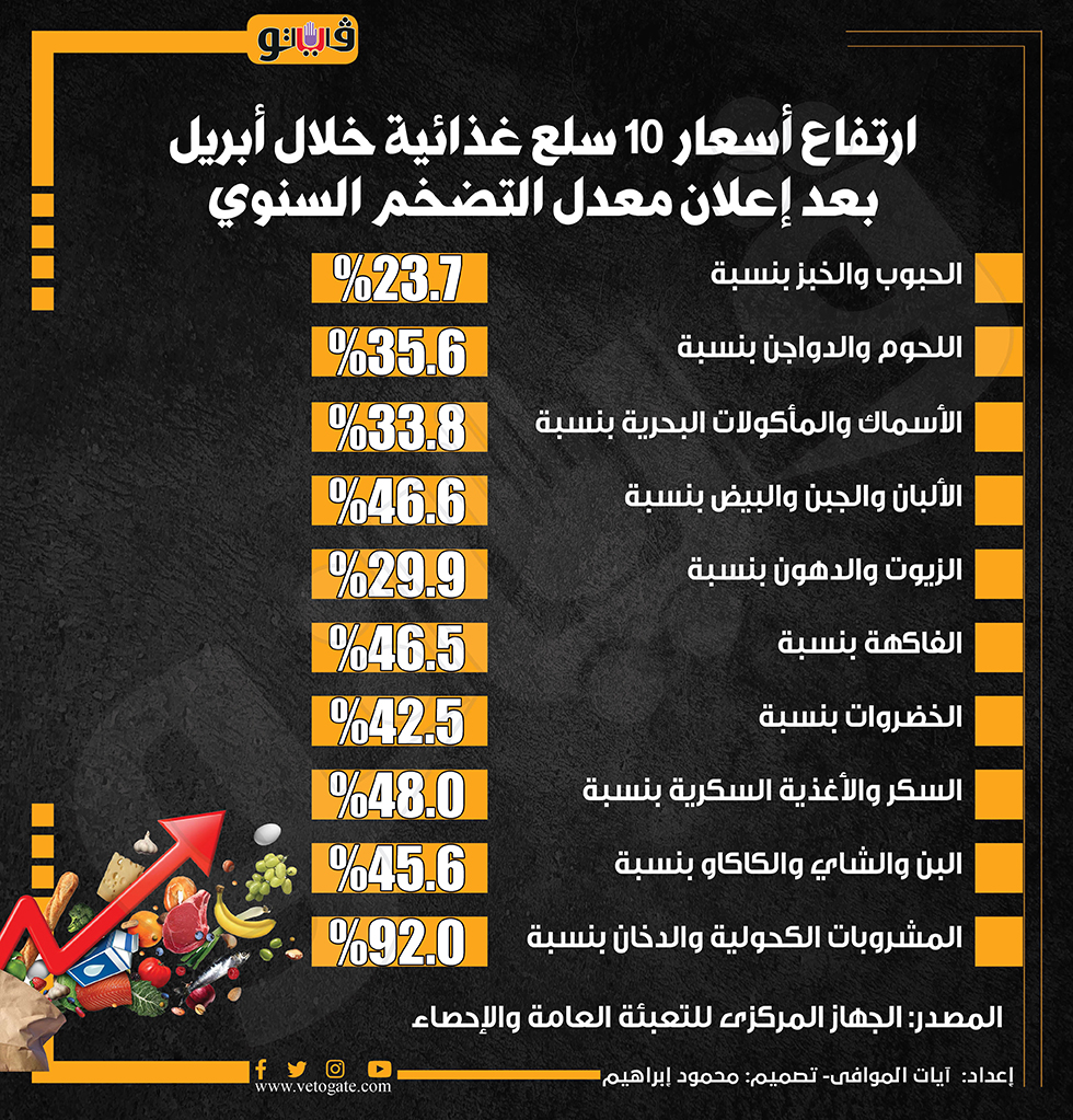ارتفاع أسعار 10 سلع غذائية خلال أبريل بعد إعلان معدل التضخم السنوي (إنفوجراف) الخميس 09/مايو/2024 - 07:30 م 5/9/2024 7:30:50 PM التضخم فى مصر آيات الموافى شارك طباعة 18 حجم الخط شارك طباعة المشروبات الكحولية التضخم اللحوم