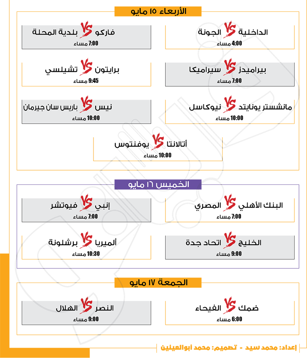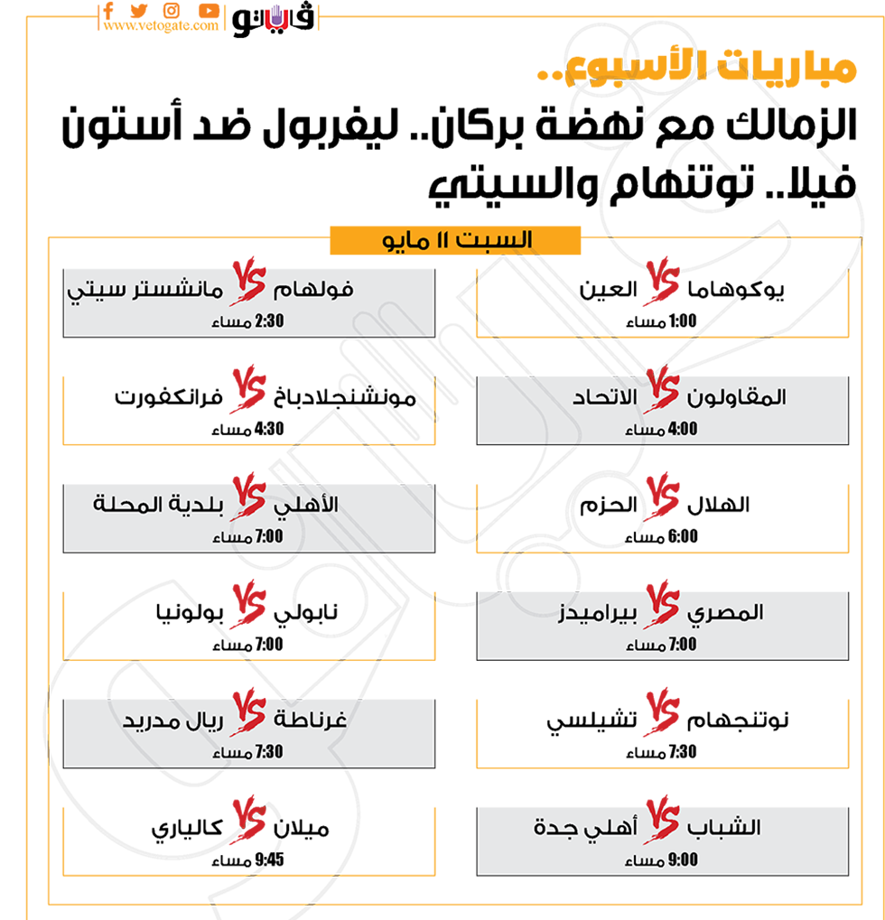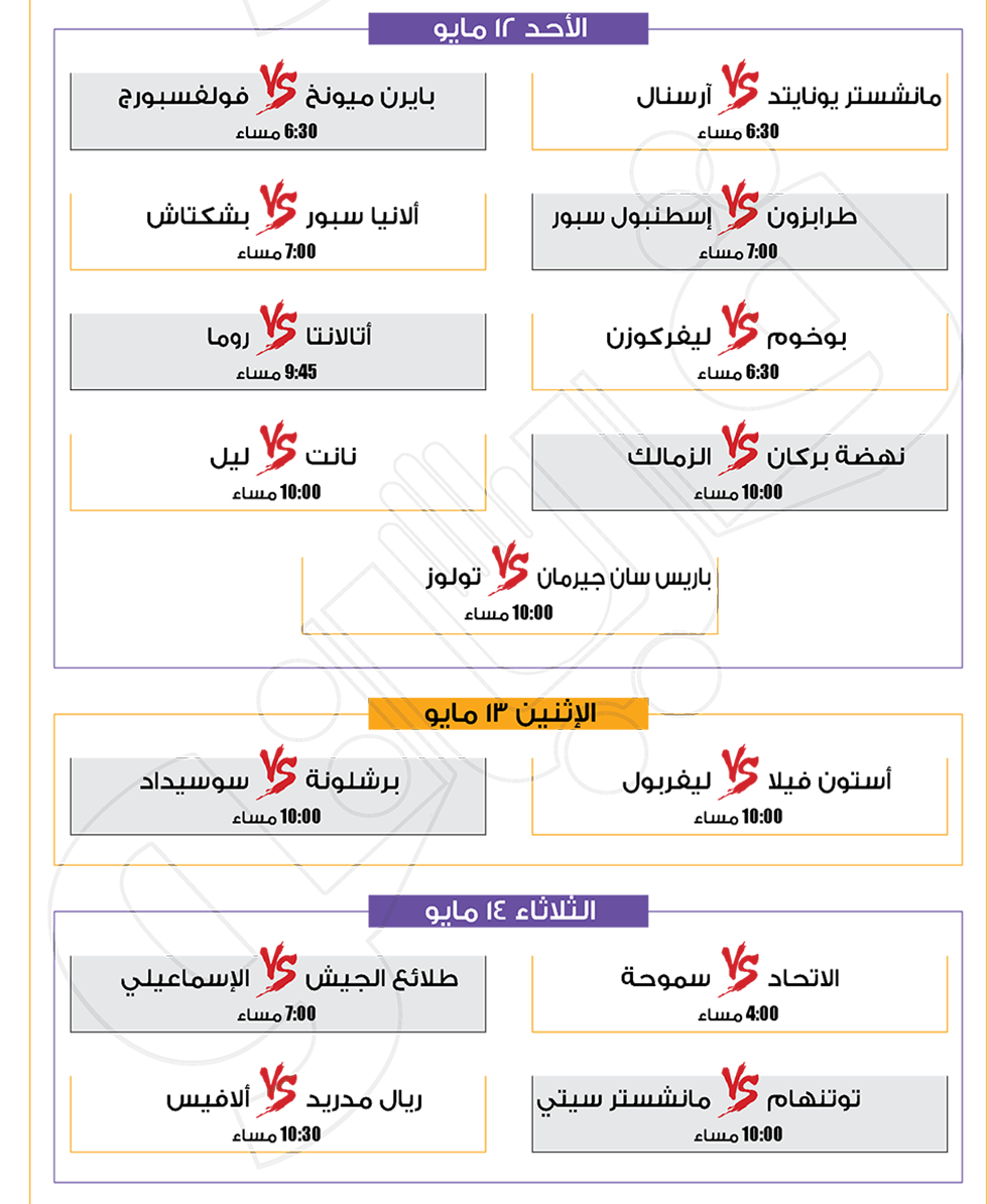 مباريات الأسبوع، الزمالك مع نهضة بركان.. ليفربول ضد أستون فيلا (إنفوجراف) الجمعة 10/مايو/2024 - 05:36 م 5/10/2024 5:36:10 PM مباريات الأسبوع،فيتو محمد سيد شارك طباعة 18 حجم الخط شارك طباعة الزمالك نهضة بركان الأهلي بيراميدز ليفربول ريال مدريد مانشستر يونايتد