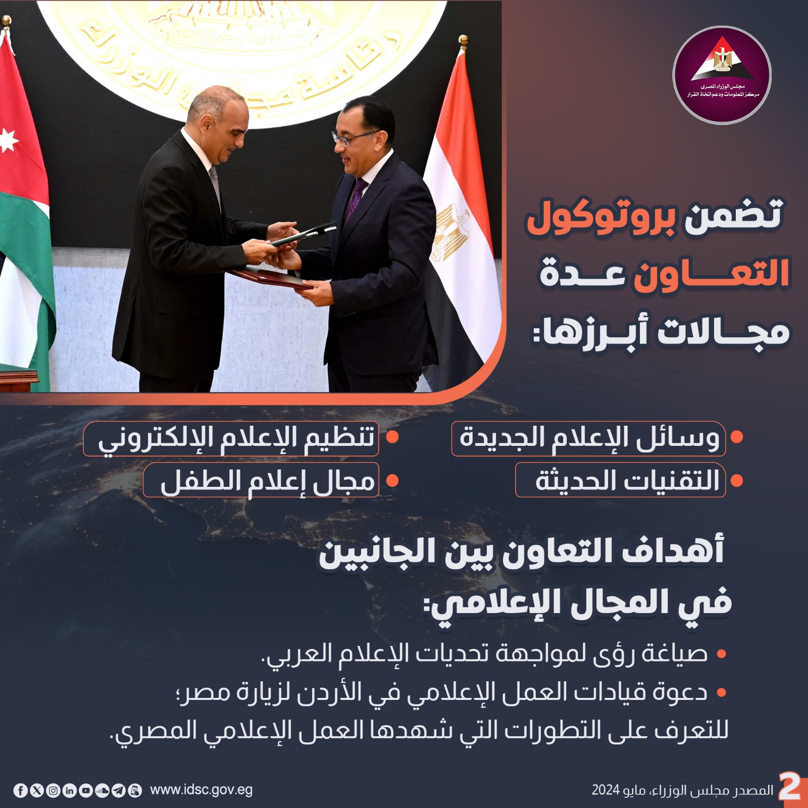 كما شهد رئيسا وزراء مصر والأردن توقيع بروتوكول تعاون في المجال الإعلامي، بين المجلس الأعلى لتنظيم الإعلام بجمهورية مصر العربية، وهيئة الإعلام بالمملكة الأردنية الهاشمية؛ تعزيزًا للعلاقات المُتميزة بين البلدين في مجال الإعلام، حيث وقع من الجانب الأردني الدكتور مُهند المُبَيضِين، وزير الاتصال الحكومي، ومن الجانب المصري كرم جبر، رئيس المجلس الأعلى لتنظيم الإعلام. لمزيد من التفاصيل