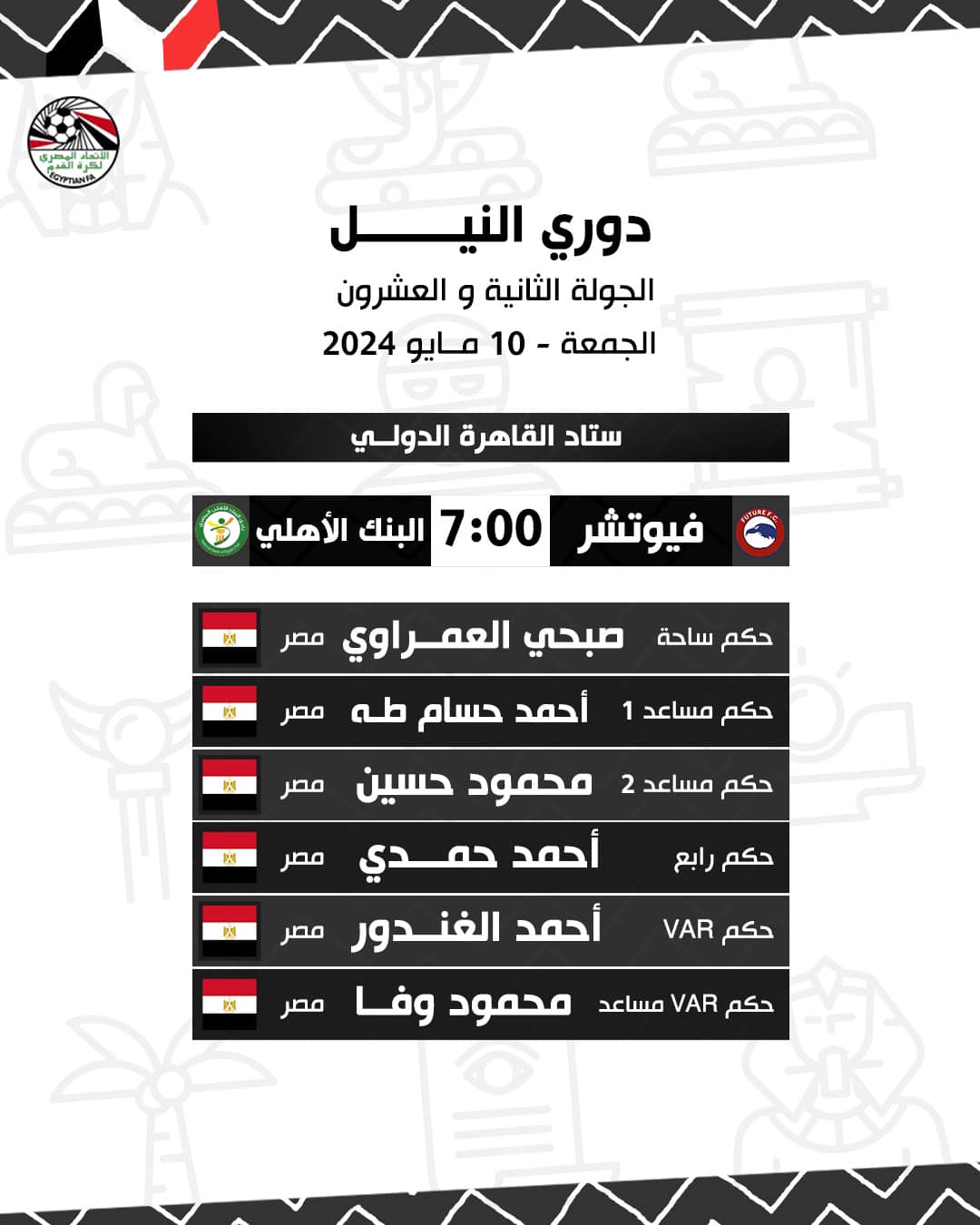 الدوري المصري، أعلنت لجنة الحكام الرئيسية باتحاد الكرة عن طاقم حكام مباريات الجمعة في الدوري المصري الممتاز ضمن مواجهات الجولة الـ 22 من البطولة.