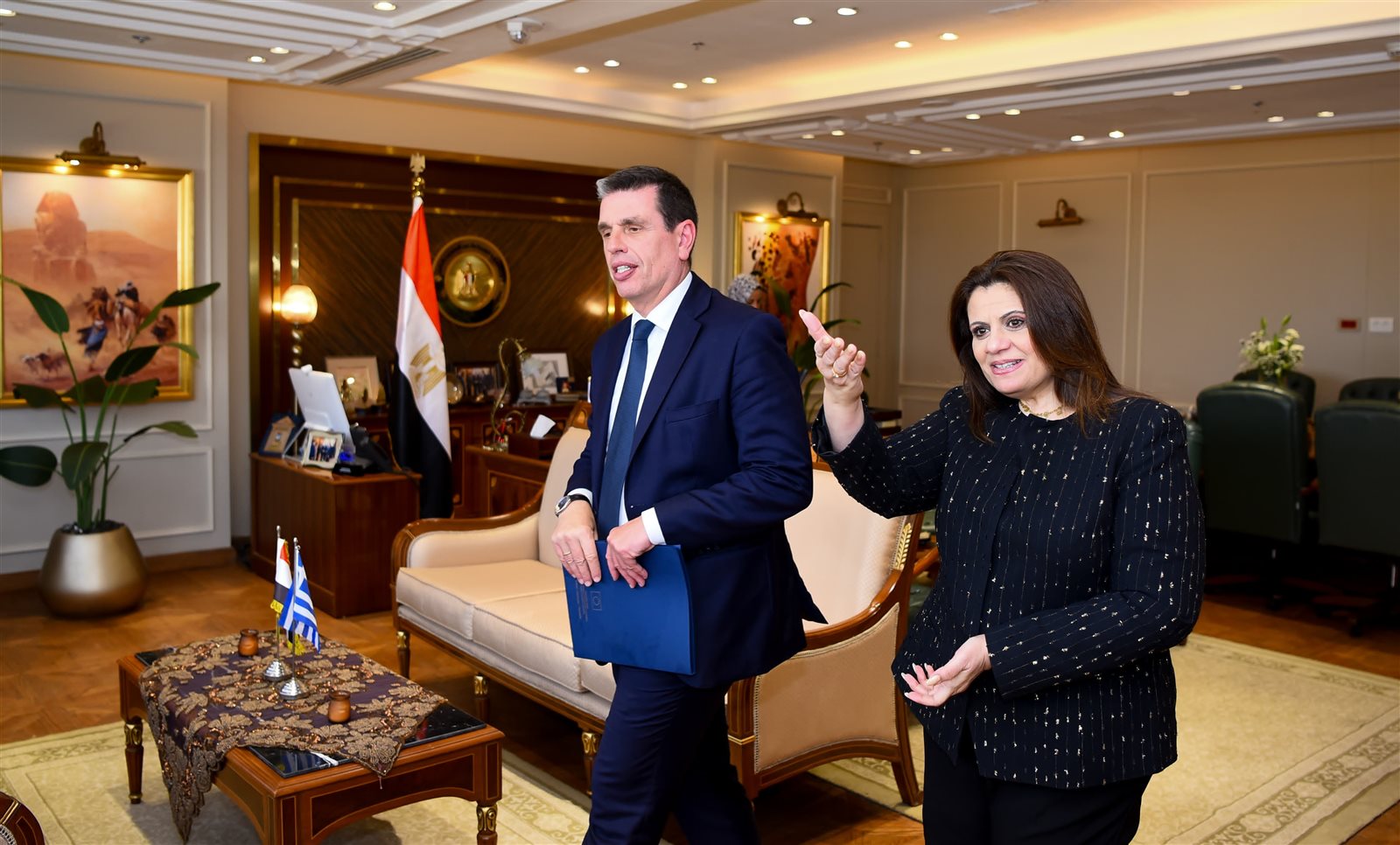 كما قامت الوزيرة بإهداء الوزير اليوناني درع وزارة الهجرة تقديرًا وتكريمًا له.