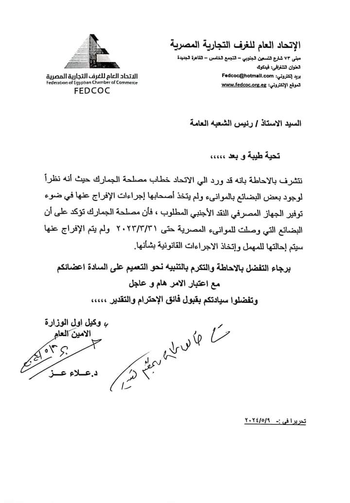 أرسلت مصلحة الجمارك المصرية خطابًا إلى الاتحاد العام للغرف التجارية بشأن البضائع في المواني.
