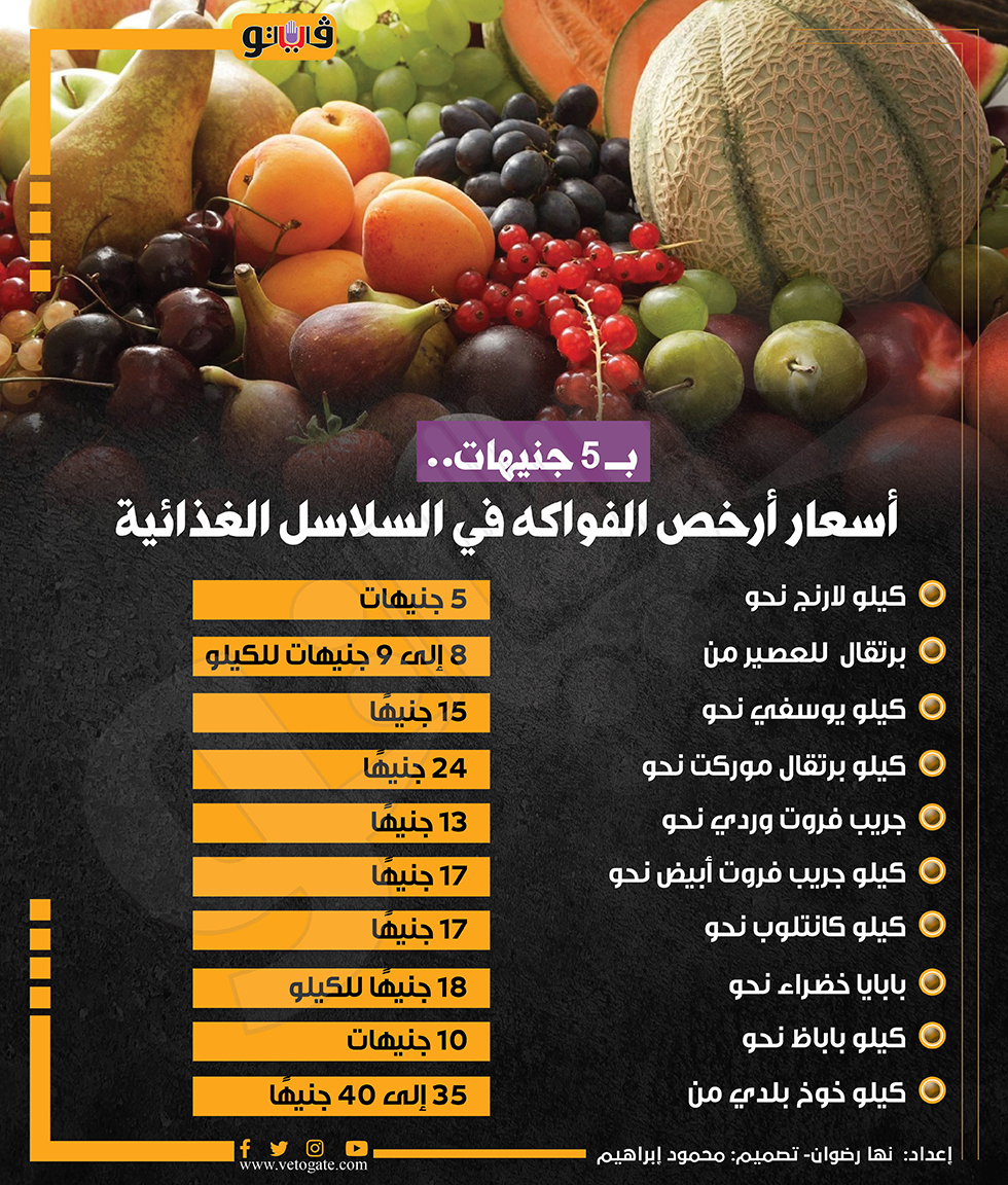 بـ 5 جنيهات.. أسعار أرخص الفواكه في السلاسل الغذائية (إنفوجراف) السبت 11/مايو/2024 - 03:30 م 5/11/2024 3:30:42 PM أسعار الفاكهة في الأسواق، فيتو نها رضوان شارك طباعة 18 حجم الخط شارك طباعة أسعار الفاكهة سعر الفاكهة اسعار الفواكه سعر الفواكه سعر البرتقال سعر الخوخ سعر الباباظ سعر كيلو باباظ