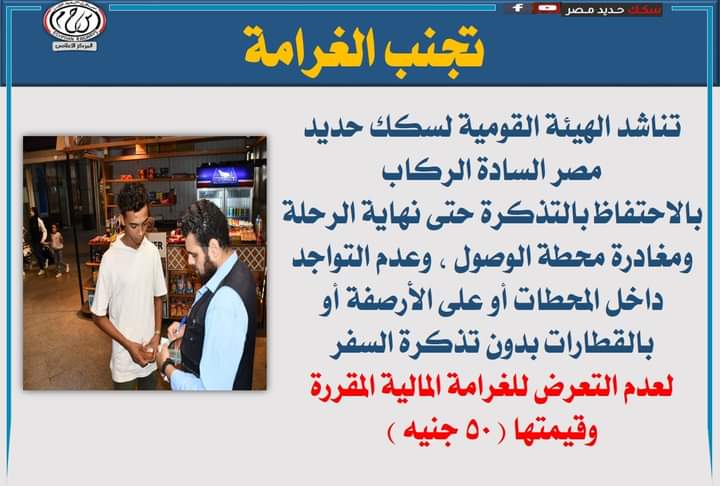 حذرت الهيئة القومية لسكك حديد مصر الركاب من التواجد داخل المحطات أو القطارات بدون تذكرة السفر، وضرورة الاحتفاظ بها حتى محطة الوصول.