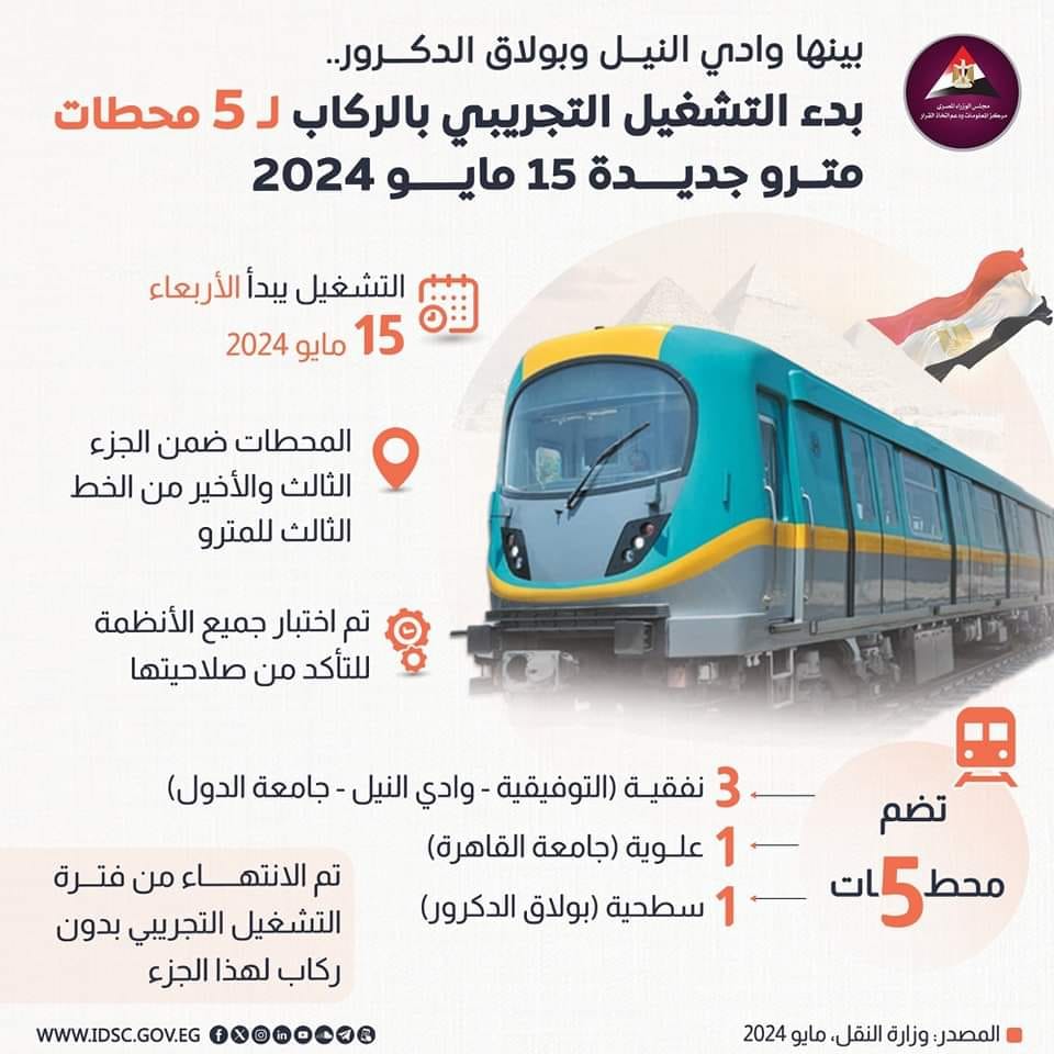 أعلنت وزارة النقل أنه تقرر بدءًا من صباح الأربعاء المقبل التشغيل التجريبى بالركاب للجزء الثالث من المرحلة الثالثة من الخط الثالث «3C» والذي يبلغ طوله 7.1 كيلو متر والممتد من محطة التوفيقية حتى جامعة القاهـرة مرورًا بشارع وادى النيل وجامعة الدول العربية وبولاق الدكرور، والذي يشمل 5 محطـات و3 محطات نفقية هي (التوفيقية ووادي النيل وجامعة الدول).