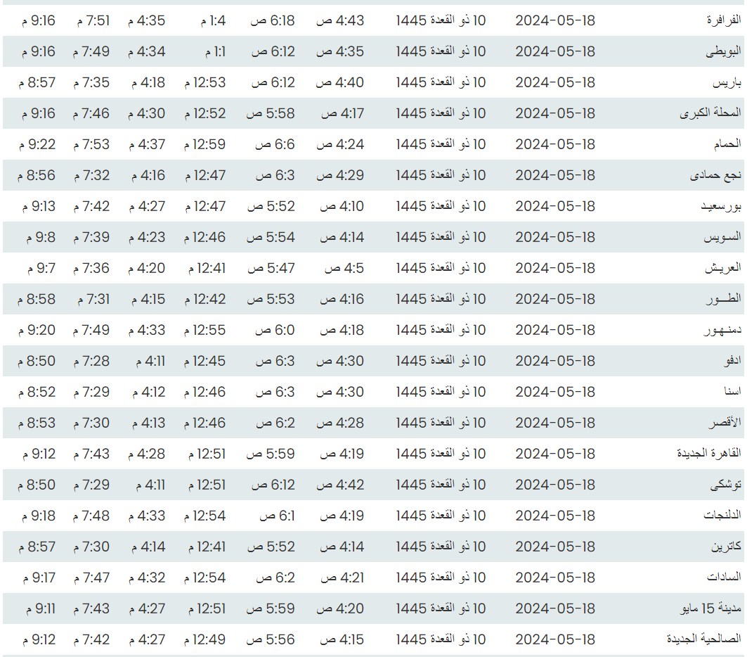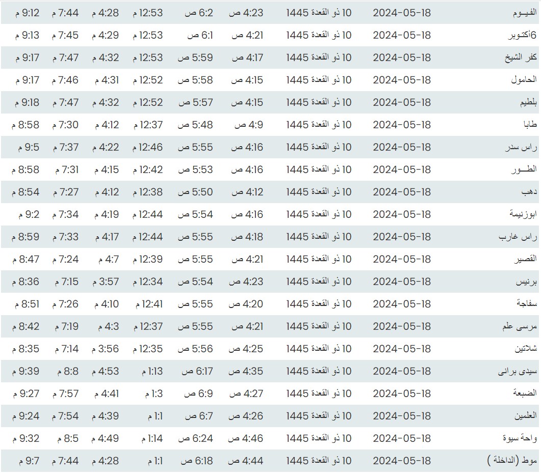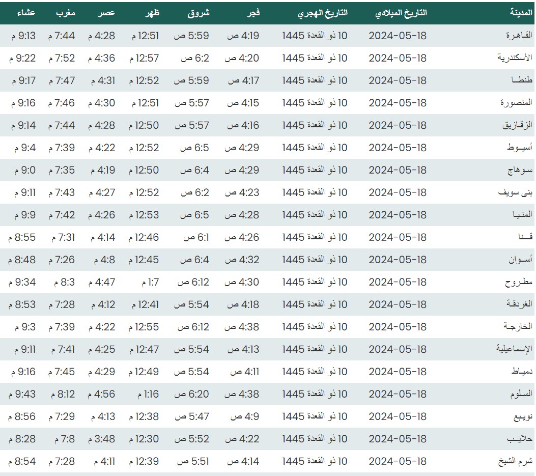 وفيما يلي مواقيت الصلاة، لعدد من مدن ومحافظات الجمهورية من واقع بيانات الهيئة العامة للمساحة