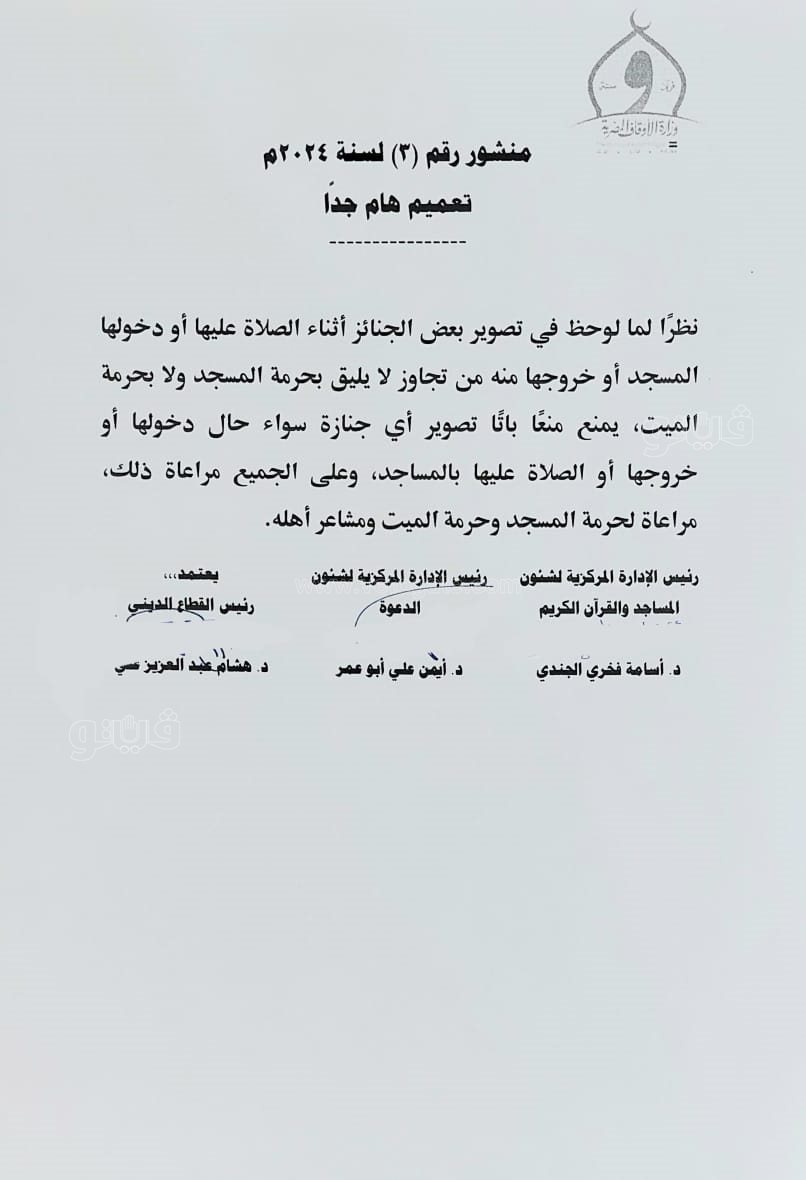 أوضحت وزارة الأوقاف أنه نظرًا لما لوحظ في تصوير بعض الجنائز أثناء الصلاة عليها أو دخولها المسجد أو خروجها منه من تجاوز لا يليق بحرمة المسجد ولا بحرمة الميت.