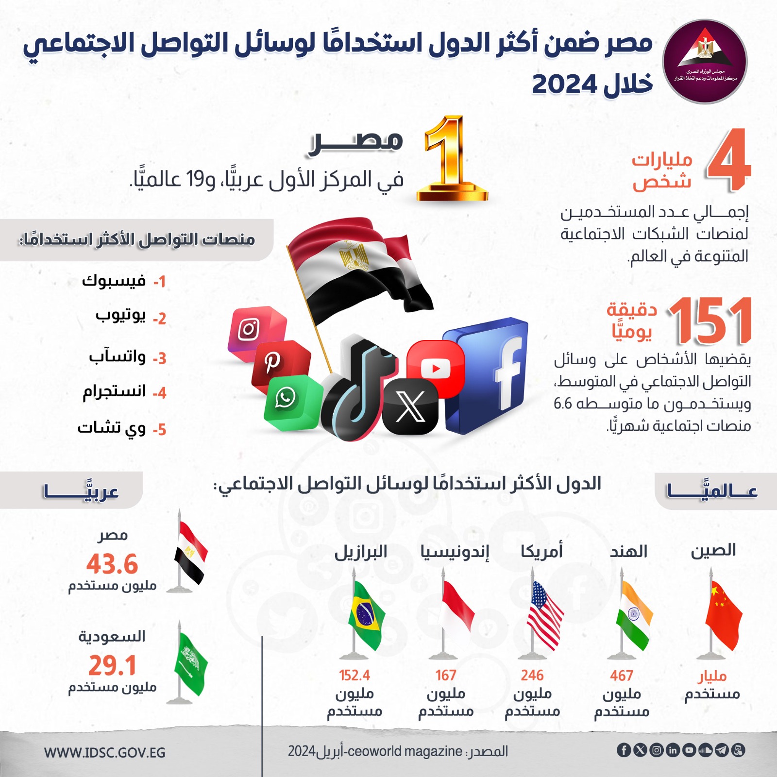 كشف مركز المعلومات ودعم اتخاذ القرار بمجلس الوزراء عن الدول الأكثر استخداما لوسائل التواصل الاجتماعي خلال 2024.