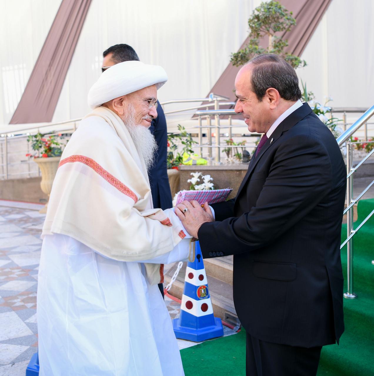 ورحب الرئيس السيسي بالسلطان مفضل سيف الدين رئيس طائفة البهرة مشيدًا بالدور الذي يقوم به السلطان والطائفة في ترميم مساجد وأضرحة آل البيت والمساجد الأثرية بالقاهرة.