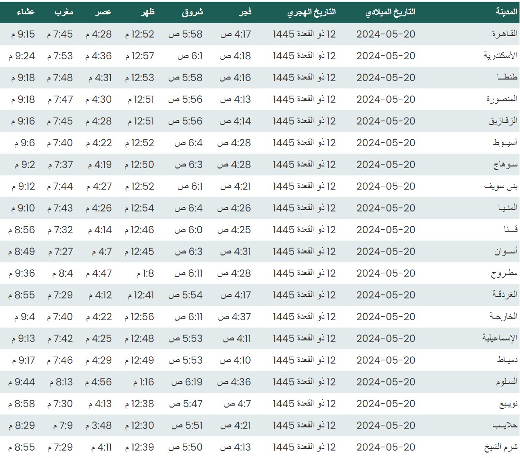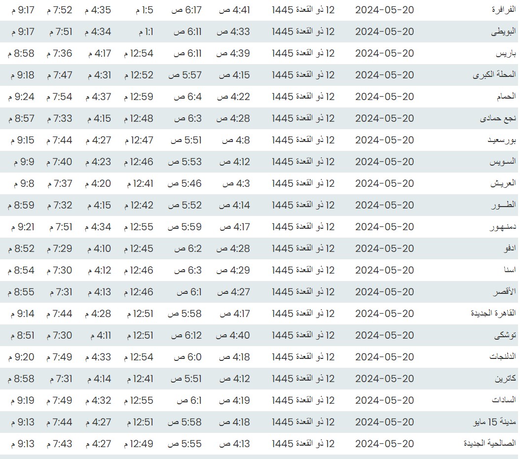وفيما يلي مواقيت الصلاة، لعدد من مدن ومحافظات الجمهورية من واقع بيانات الهيئة العامة للمساحة
