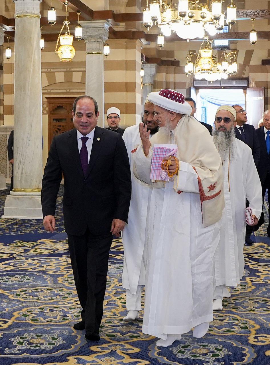 ورحب الرئيس السيسي بالسلطان مفضل سيف الدين رئيس طائفة البهرة مشيدًا بالدور الذي يقوم به السلطان والطائفة في ترميم مساجد وأضرحة آل البيت والمساجد الأثرية بالقاهرة.