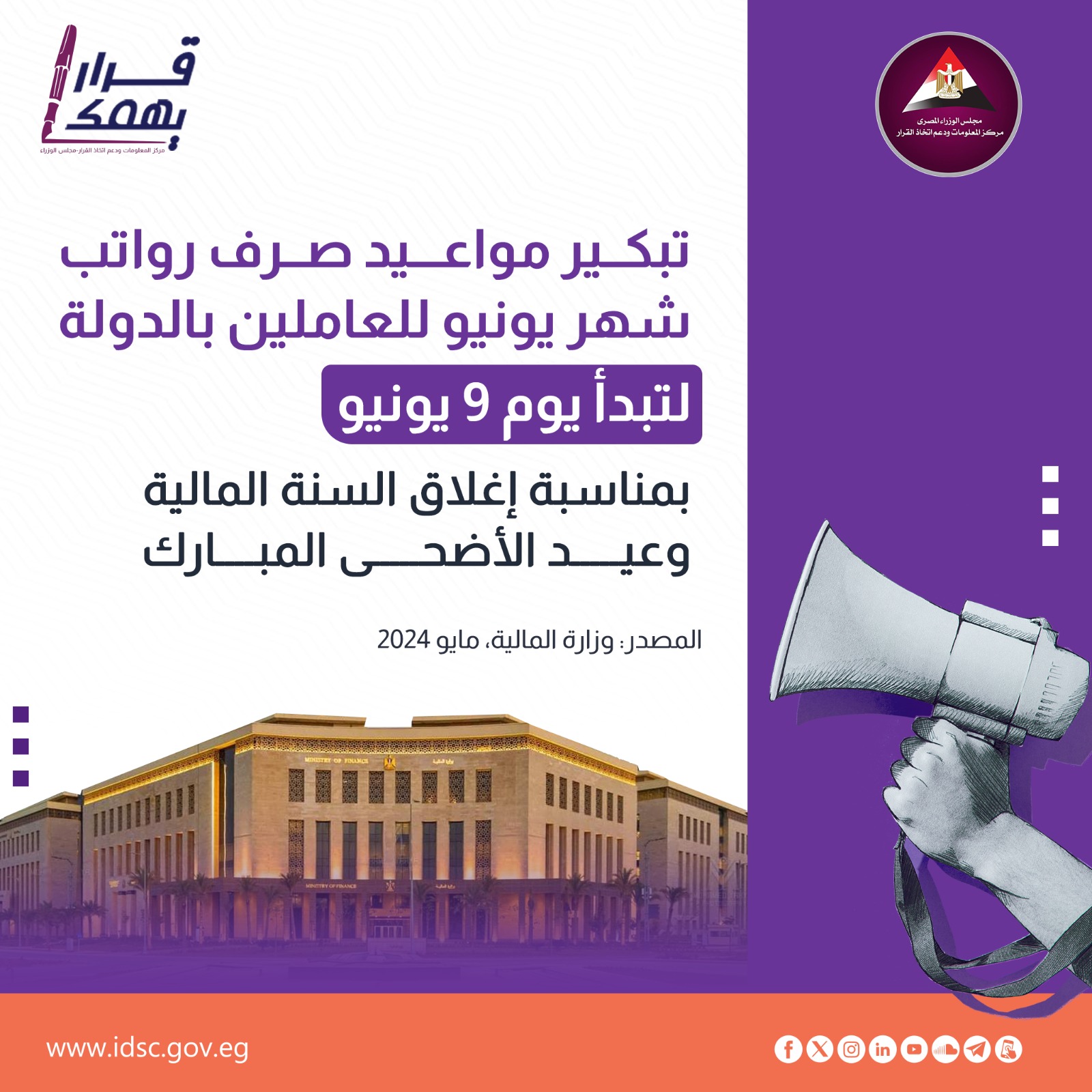 سلط مركز معلومات مجلس الوزراء الضوء على تبكير موعد صرف رواتب شهر يوليو للعاملين بالدولة لتبدأ من يوم 9 يونيو.