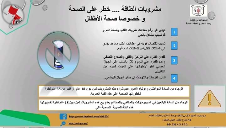 وقال المعهد القومي للتغذية أن مشروبات الطاقة تؤدي إلى زيادة ضربات القلب ومشاكل بالكلى وضغط الدم.