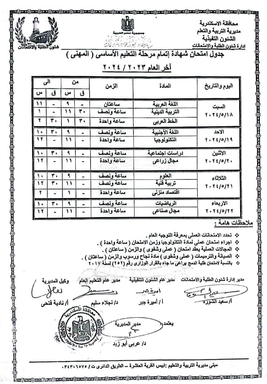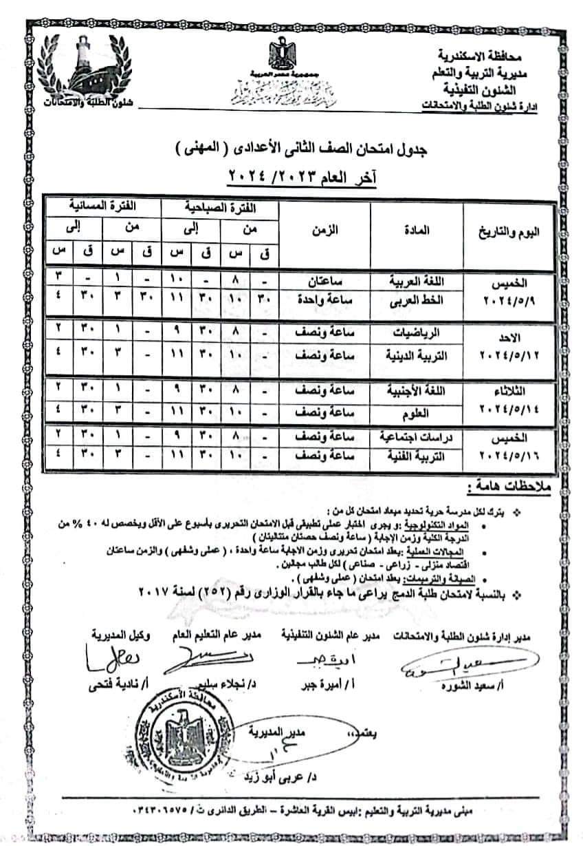 جداول امتحانات الشهادة الاعدادية 2024 في الإسكندرية