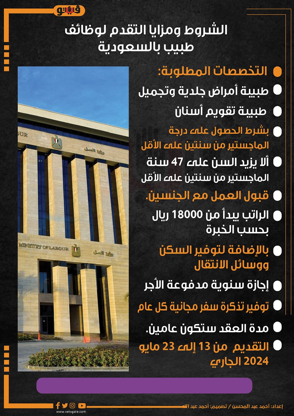 الشروط ومزايا التقدم لوظائف طبيب بالسعودية (إنفوجراف) الإثنين 13/مايو/2024 - 12:10 م 5/13/2024 12:10:36 PM وزارة العمل،فيتو أحمد عبدالمحسن شارك طباعة 18 حجم الخط شارك طباعة أمراض جلدية درجة الماجستير التخصصات المطلوبة تجميل الماجستير