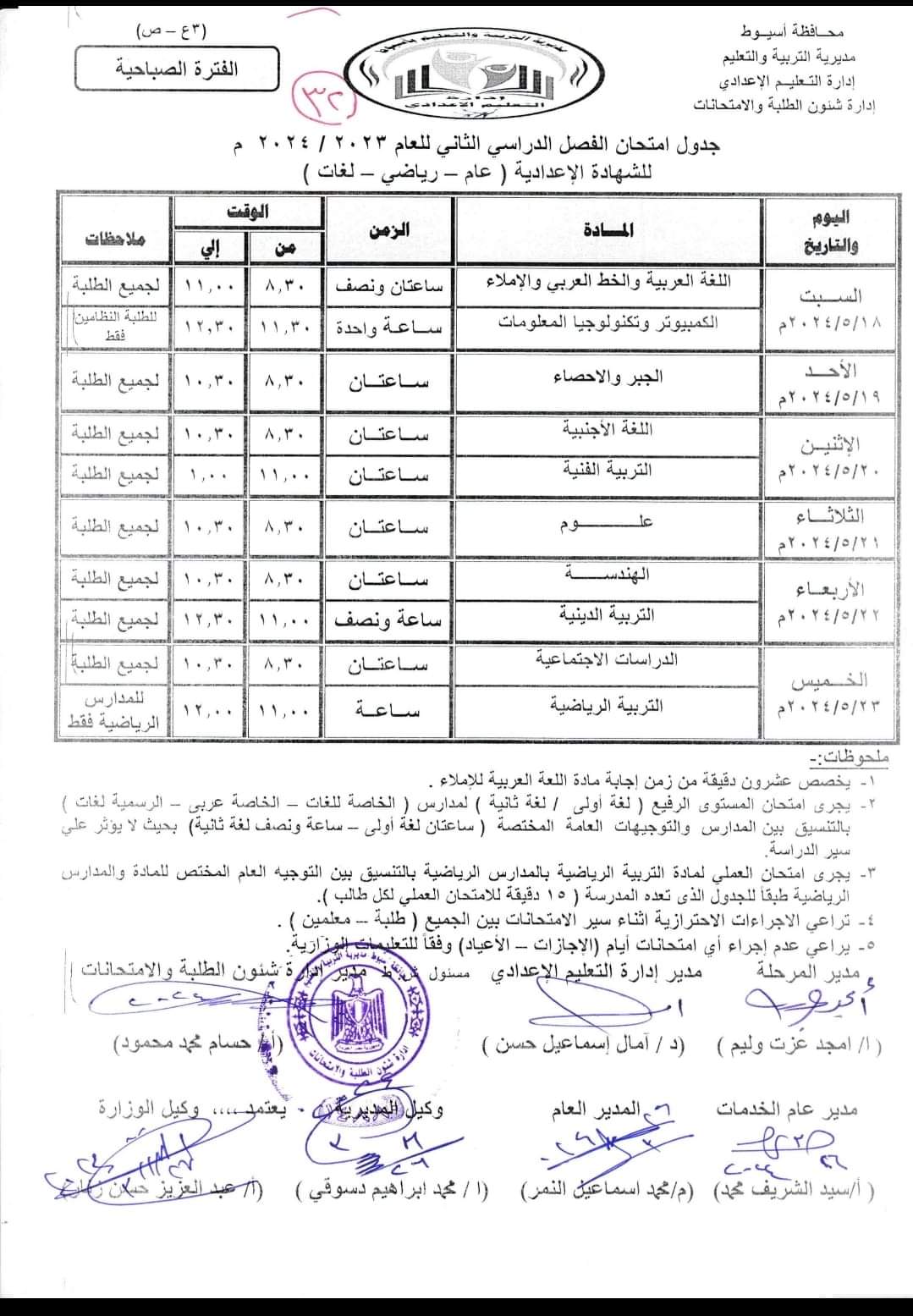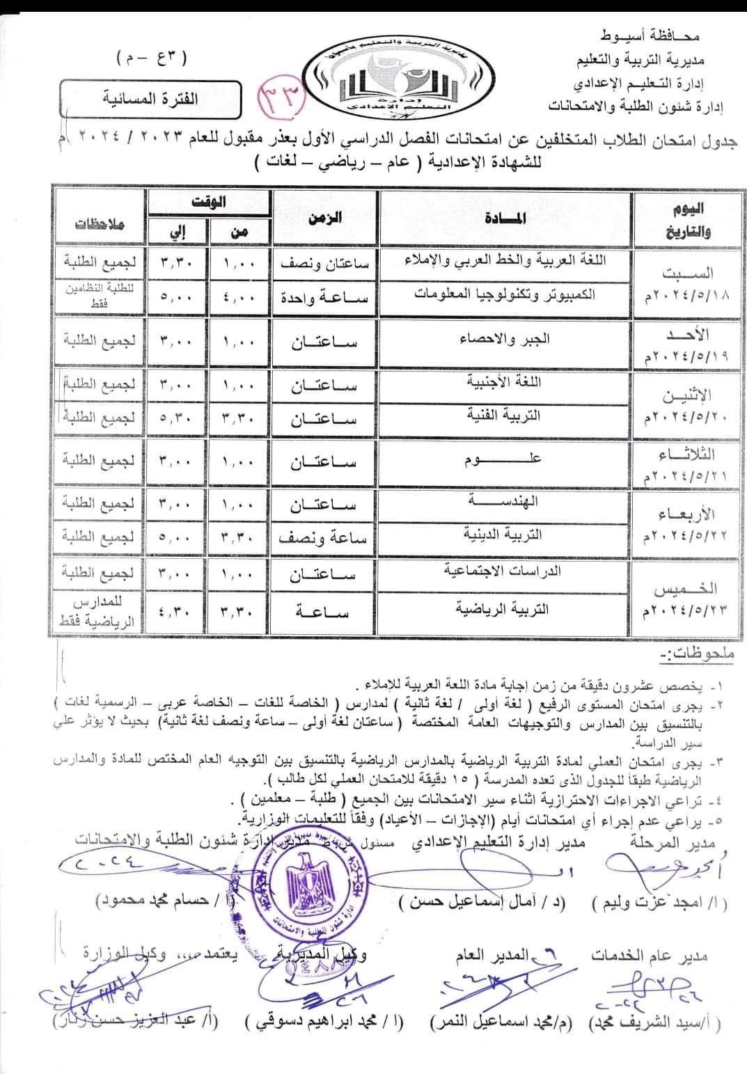 جداول امتحانات الشهادة الإعدادية 2024 بمحافظة أسيوط