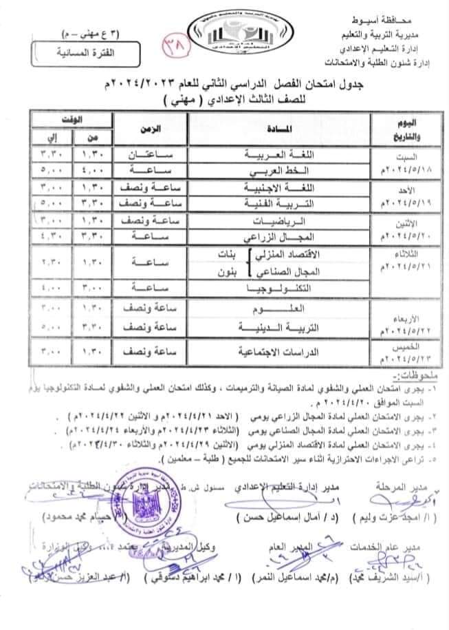جداول امتحانات الإعدادية والمهنية للفصل الدراسي الثاني بمحافظة أسيوط