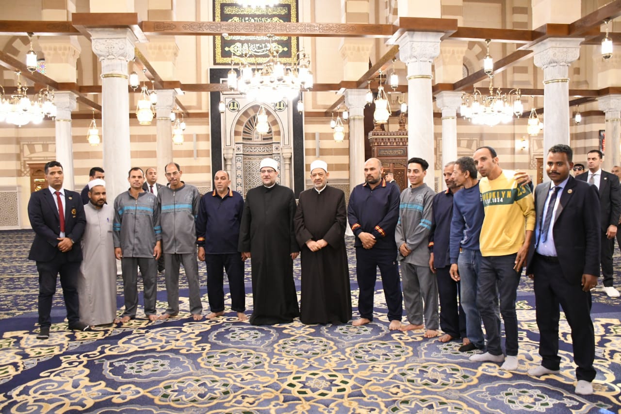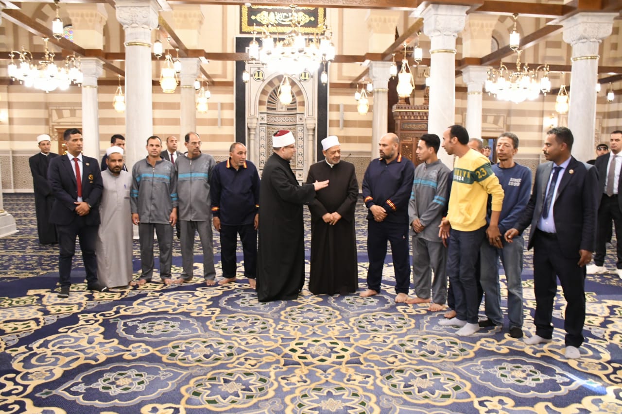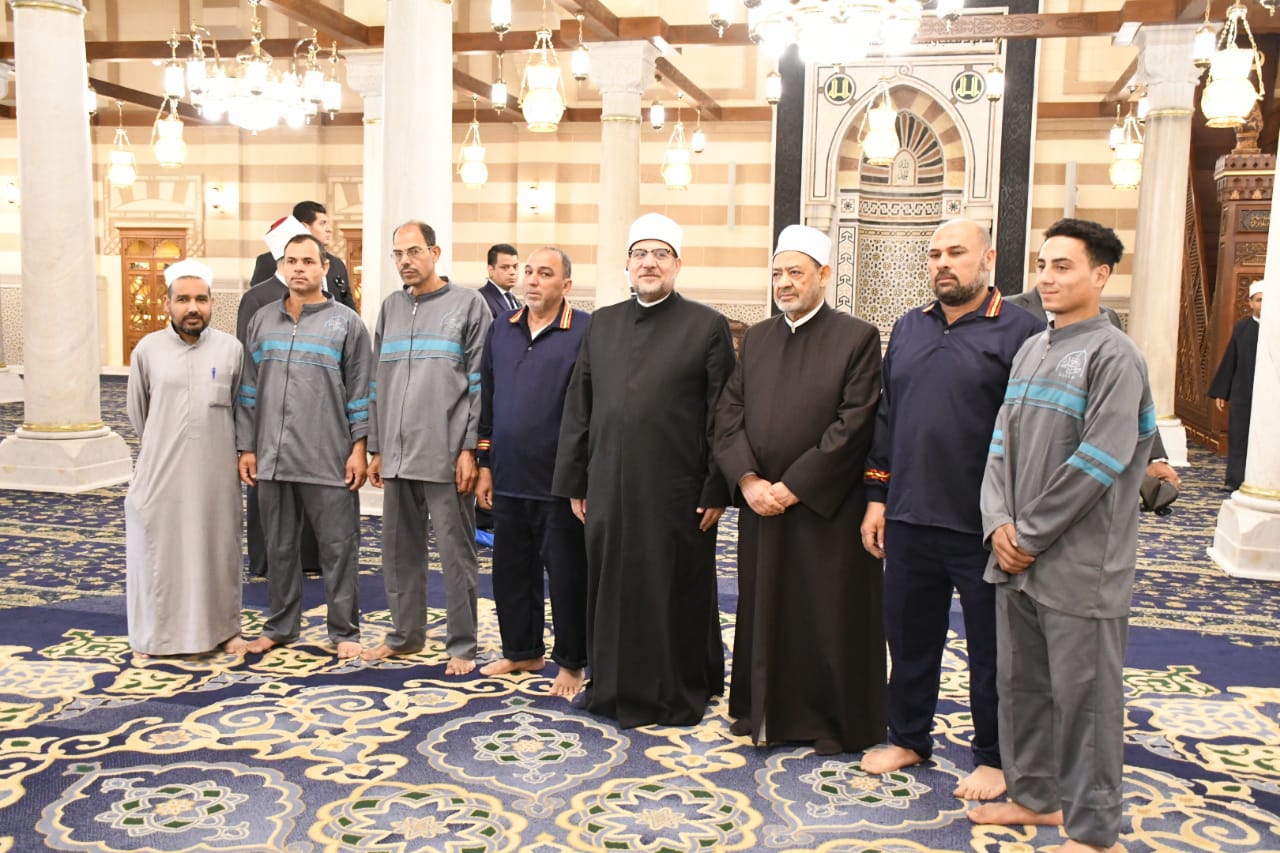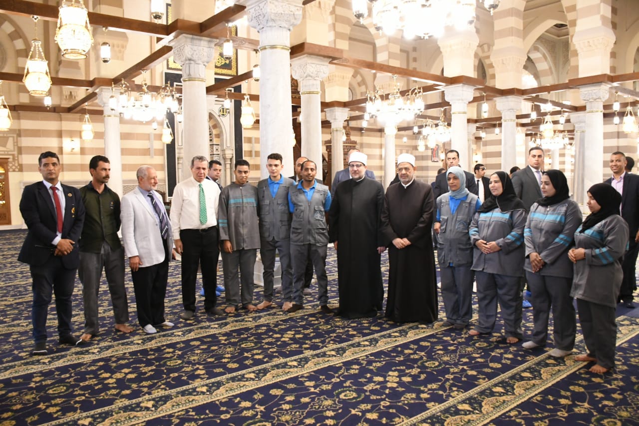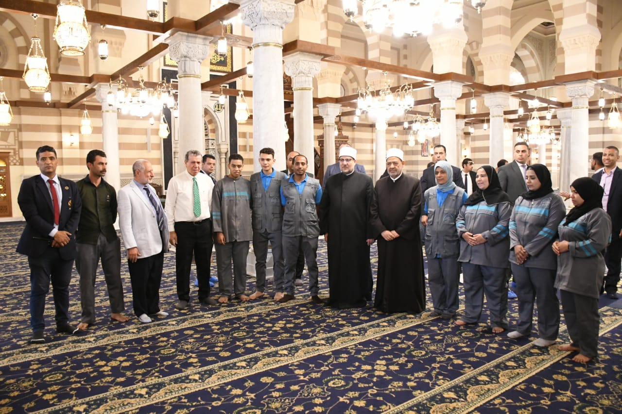 وحرص فضيلة الإمام الأكبر على الدعاء للعاملين بالمسجد، وبخاصة الخدمات المعاونة وتحفيزهم والتقاط الصور معهم دعمًا لجهودهم في خدمة المسجد.