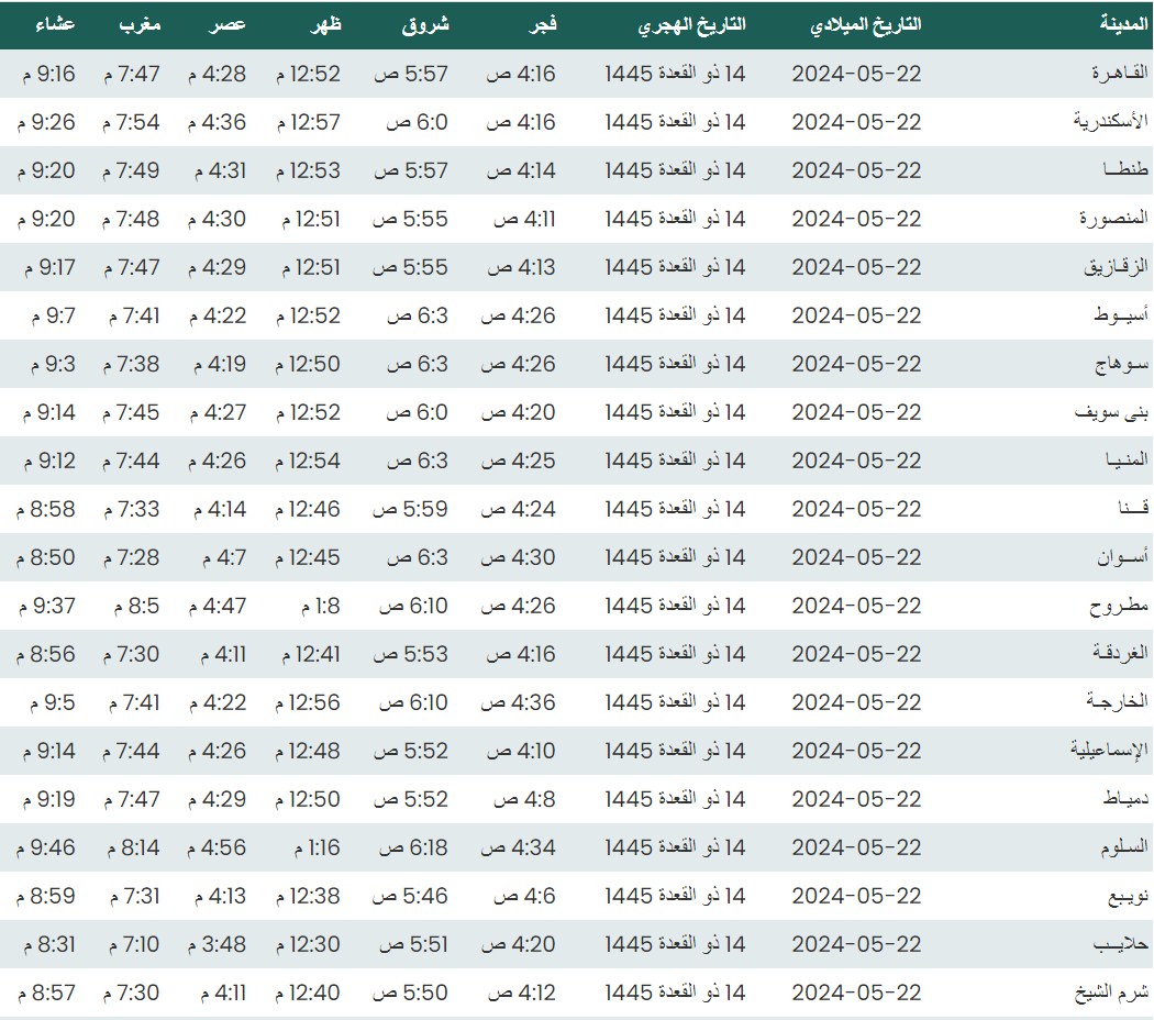 مواقيت الصلاة اليوم وفقًا للتوقيت المحلي لمدينتي القاهرة والإسكندرية وكذلك،مواقيت الصلاة، لعدد من مدن ومحافظات الجمهورية من واقع بيانات الهيئة العامة للمساحة