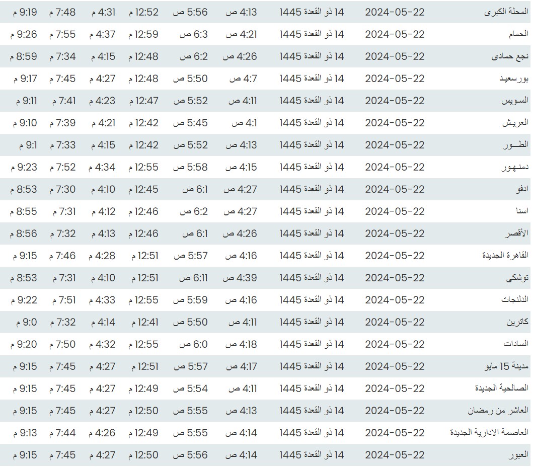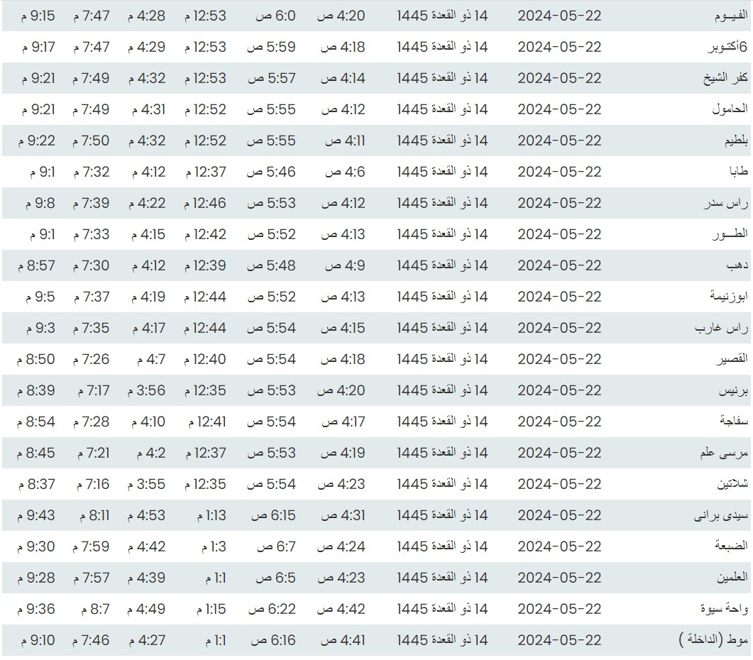 وفيما يلي مواقيت الصلاة، لعدد من مدن ومحافظات الجمهورية من واقع بيانات الهيئة العامة للمساحة