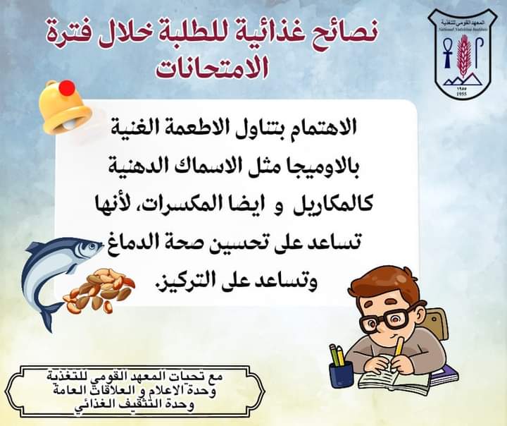 وأكد المعهد القومى للتغذية أهمية تناول الأطعمة الغنية بالحديد مثل الكبدة واللحوم الحمراء والخضراوات الورقية الداكنة والعسل الاسود وتناول فاكهة الموسم أثناء فترة الراحة من المذاكرة