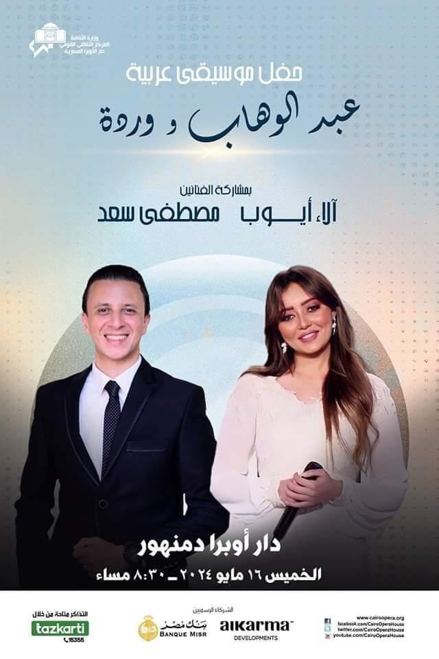 ويبدأ الحفل فى الثامنة والنصف مساء الخميس 16 مايو على مسرح أوبرا دمنهور ويحييه كل من آلاء أيوب ومصطفى سعد ويتضمن البرنامج نخبة مختارة من اعمال موسيقار الاجيال محمد عبد الوهاب والمطربة وردة منها في يوم وليلة، لولا الملامة، أكدب عليك، العيون السود، اشترونى، كنت فين، يا مسافر وحدك، قول لي عملك إيه قلبى، أنا لك على طول، لا مش أنا اللي أبكى وغيرها.