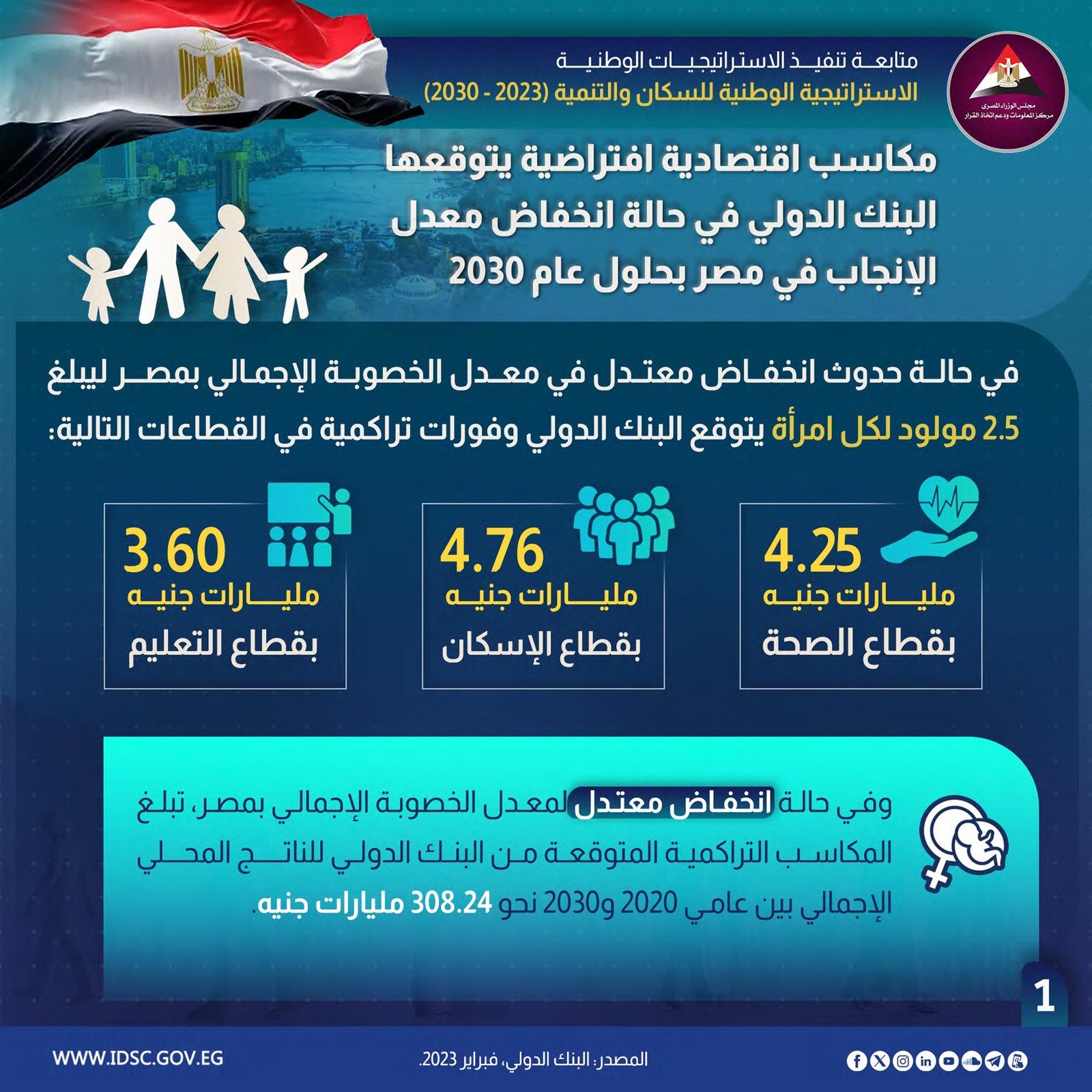 وأشار في ذلك إلى أن الاستراتيجية القومية للسكان والتنمية (2030-2023) تستهدف وصول معدل الإنجاب الكلي إلى 2.1 طفل لكل سيدة بحلول عام 2030 وذلك من خلال صياغة الفروض المختلفة للإنجاب على فترات زمنية عشرية خلال فترة الإسقاط (2022-2072)، ففي حالة الفرض المنخفض سيكون الوصول إلى معدل الإنجاب 2.1 طفل لكل سيدة في عام 2032.