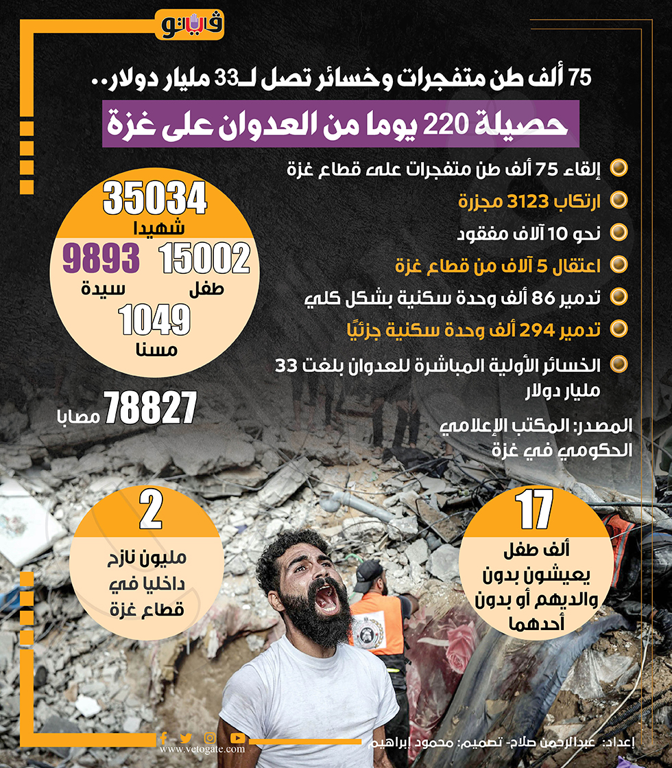 75 ألف طن متفجرات وخسائر تصل لـ33 مليار دولار.. حصيلة 220 يوما من العدوان على غزة (إنفوجراف) الإثنين 13/مايو/2024 - 11:22 م 5/13/2024 11:22:13 PM غزة، فيتو عبدالرحمن صلاح شارك طباعة 18 حجم الخط شارك طباعة غزة قطاع غزة طوفان الأقصى جيش الاحتلال فلسطين العدوان على غزة إسرائيل