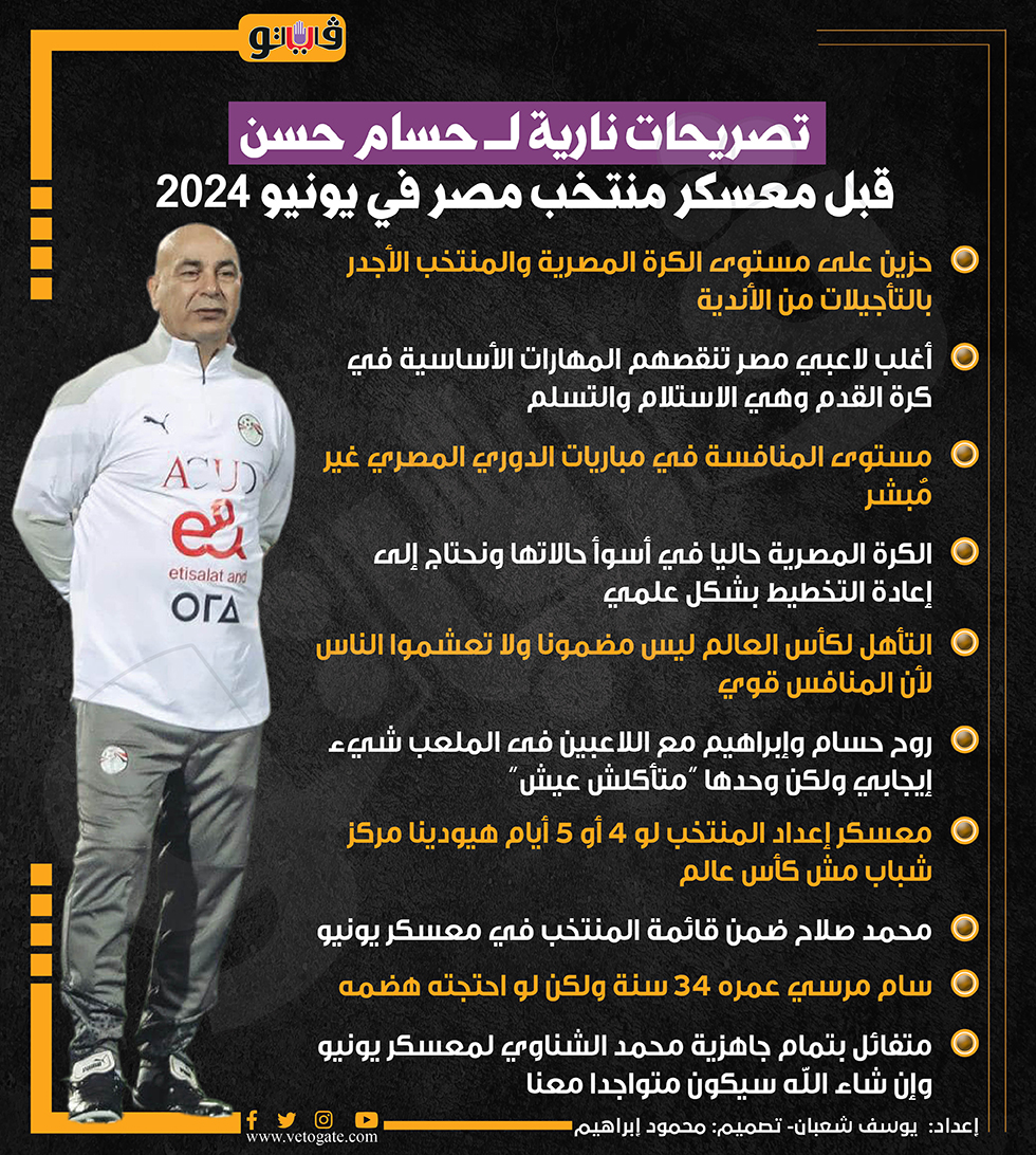 تصريحات نارية لـ حسام حسن قبل معسكر منتخب مصر في يونيو 2024 (إنفوجراف) الإثنين 13/مايو/2024 - 09:25 م 5/13/2024 9:25:03 PM حسام حسن يوسف شعبان شارك طباعة 18 حجم الخط شارك طباعة حسام حسن منتخب مصر حسام حسن مدرب منتخب مصر أخبار منتخب مصر الوطني لكرة القدم تصريحات حسام حسن معكسر منتخب مصر