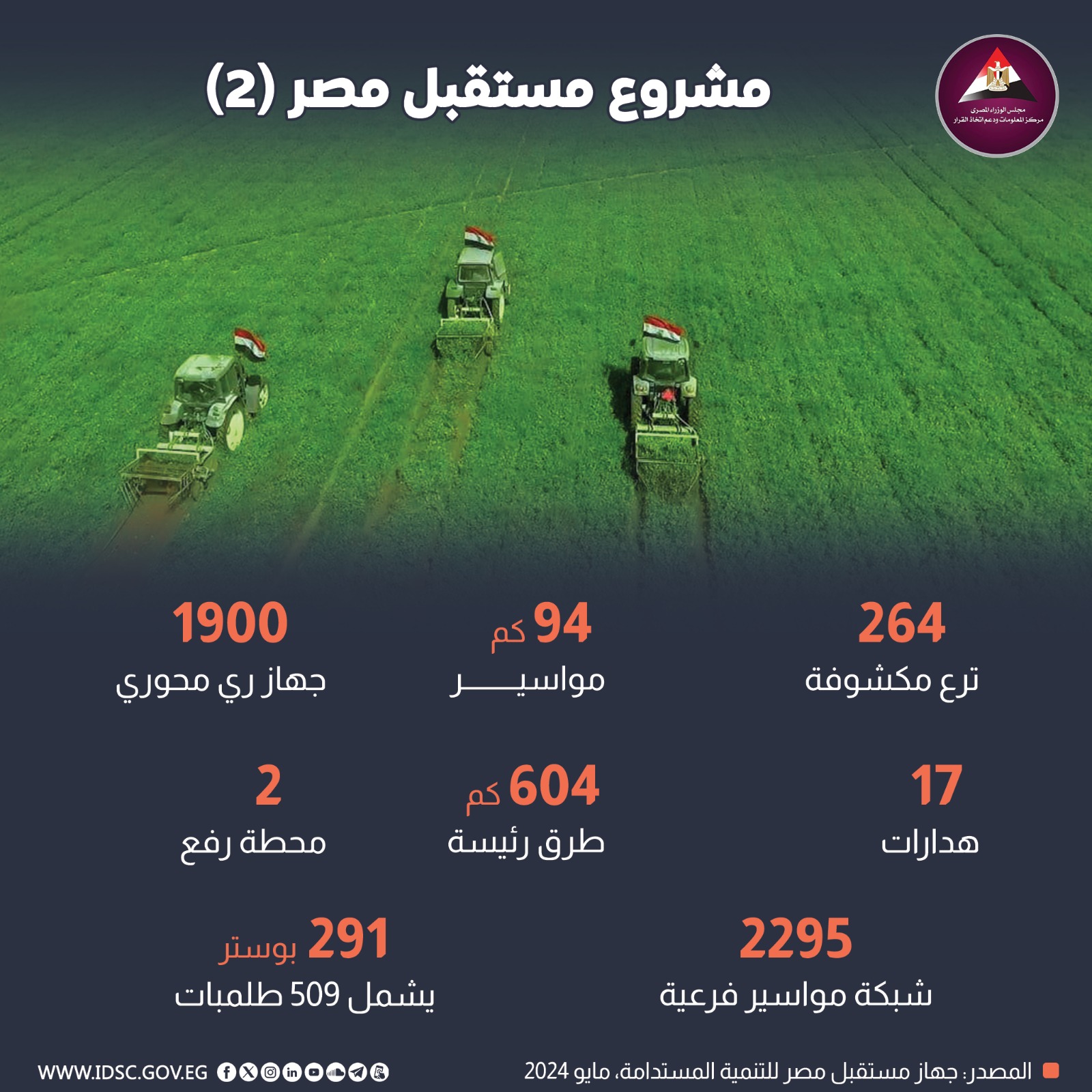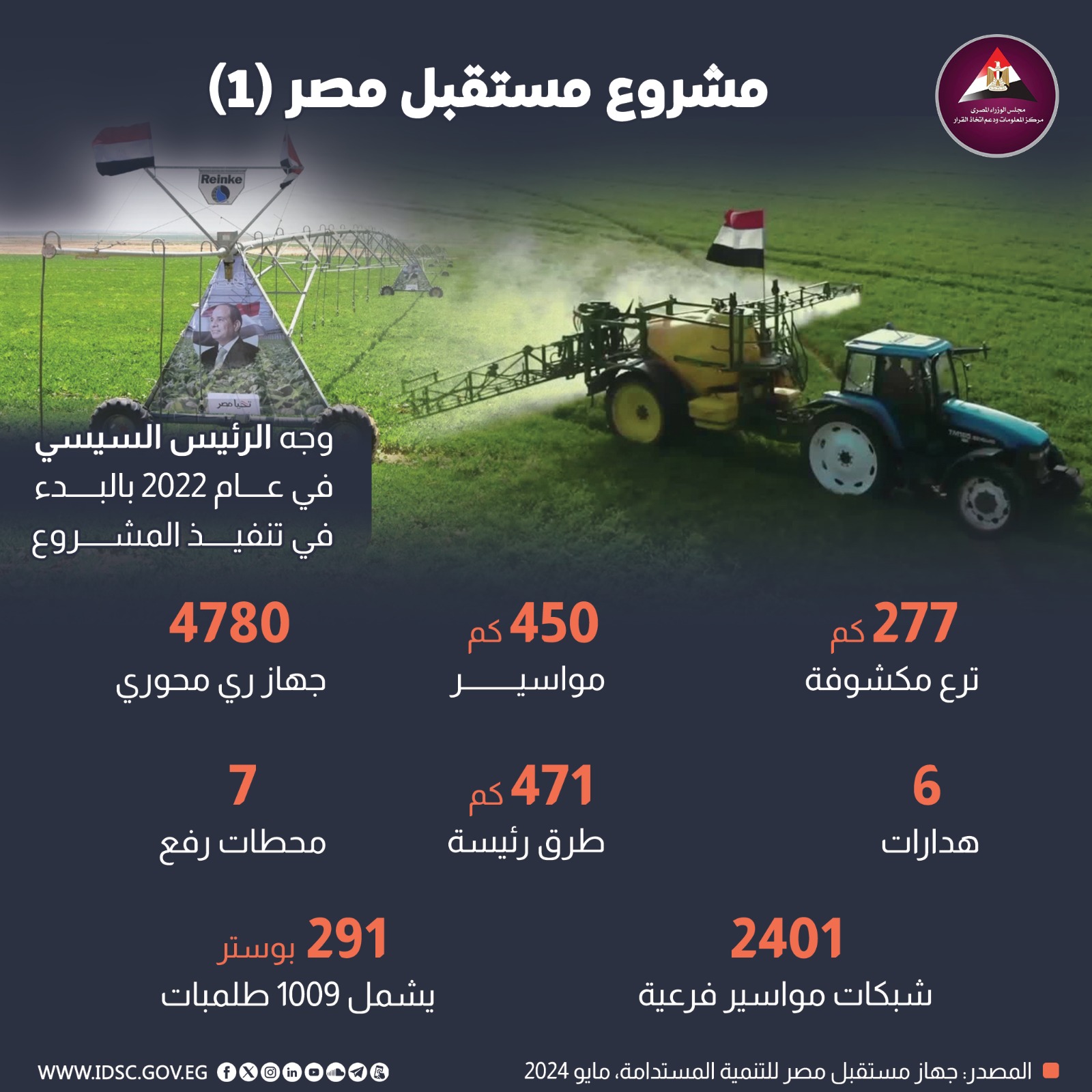 سلط مركز معلومات مجلس الوزراء الضوء على مشروع مستقبل مصر للتنمية المستدامة ودور في تحقيق الاكتفاء الذاتي من الحاصلات الزراعية وتصدير الفائض من أجل توفير العملة الأجنبية.