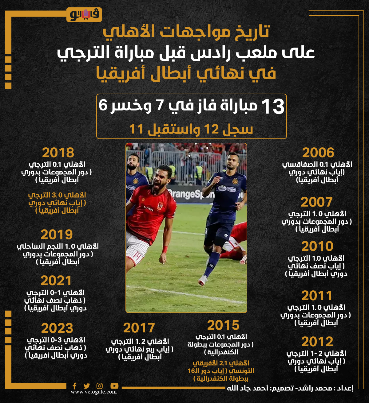 تاريخ مواجهات الأهلي على ملعب رادس قبل مباراة الترجي في نهائي أبطال أفريقيا (إنفوجراف) الثلاثاء 14/مايو/2024 - 12:30 م 5/14/2024 12:30:54 PM الأهلي والترجي التونسي، فيتو محمد راشد شارك طباعة 18 حجم الخط شارك طباعة نادي الاهلي ملعب رادس الأهلي الصفاقسي الترجى الإفريقي التونسي النجم الساحلى