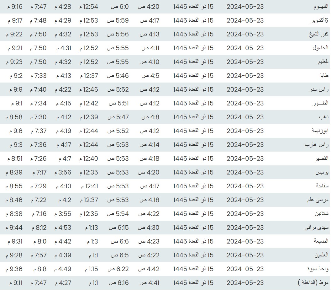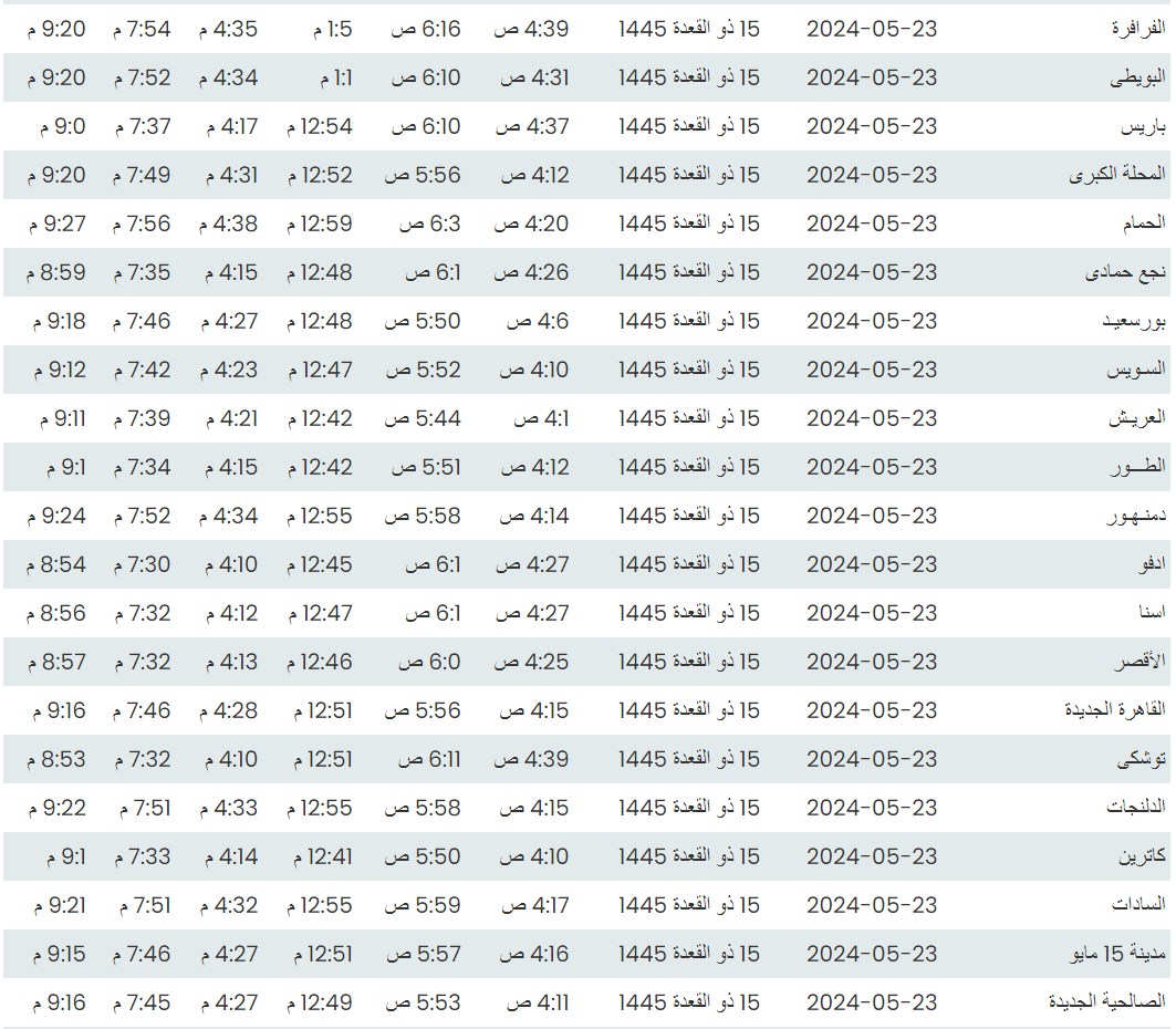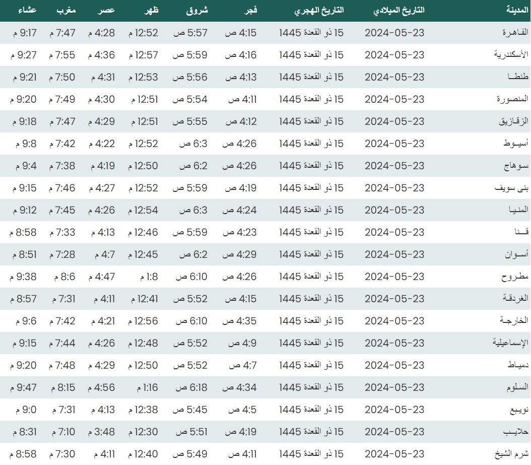 وفيما يلي مواقيت الصلاة، لعدد من مدن ومحافظات الجمهورية من واقع بيانات الهيئة العامة للمساحة