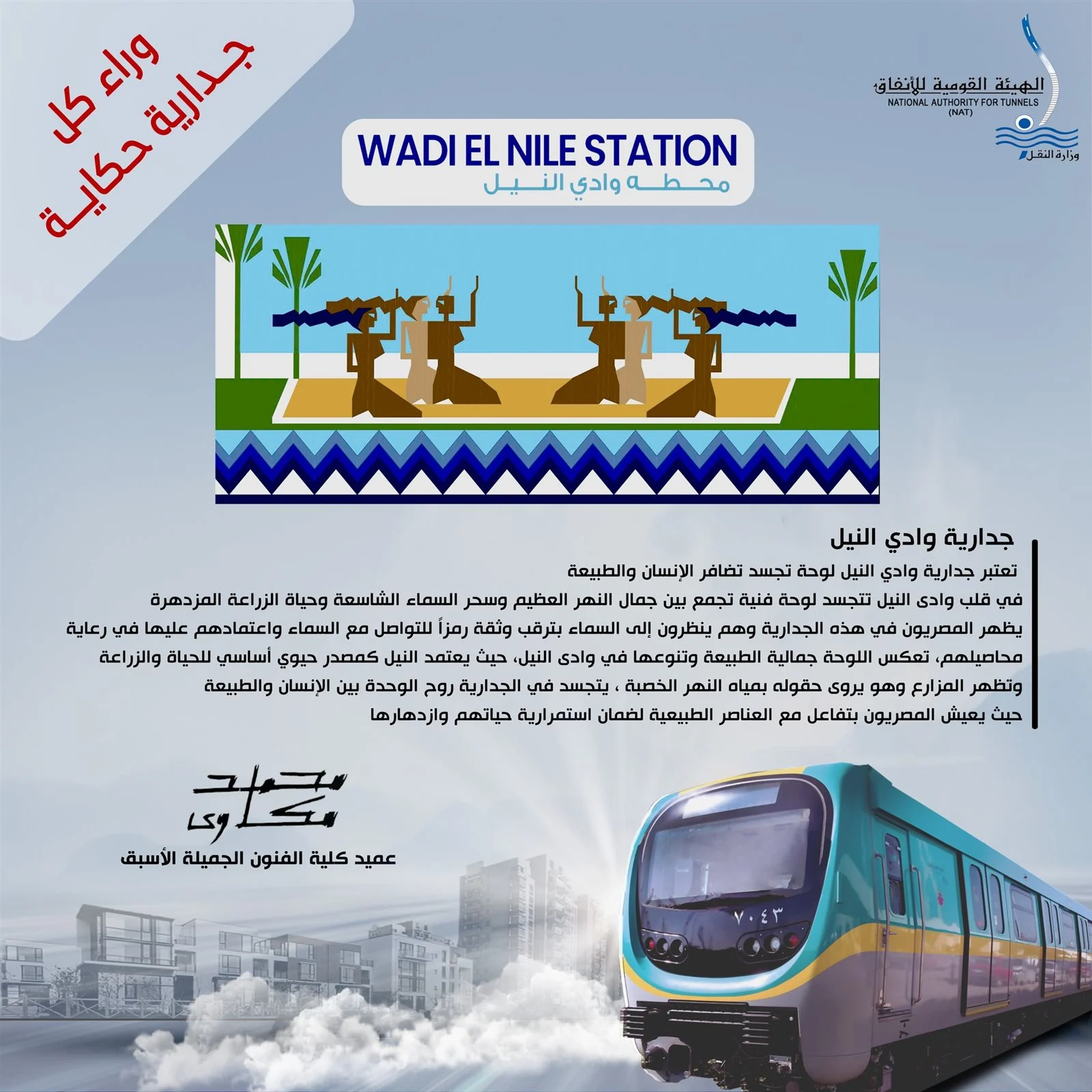 كشفت الهيئة القومية للأنفاق عن جدارية محطة وادي النيل بالجزء الثالث من الخط الثالث للمترو قبل افتتاح المحطة بيومين، حيث قامت الهيئة بعمل رسومات فنية لكل محطة من المحطات الجديدة تعكس طبيعة موقع المحطة وأهميتها.