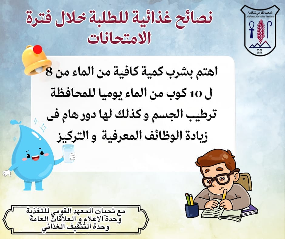 نصح المعهد القومي للتغذية الطلبة خلال فترة الامتحانات بالاهتمام بشرب كمية كافية من الماء من 8 إلى 10 أكواب للحفاظ على ترطيب الجسم، خاصة وأن شرب كمية كبيرة من الماء يساعد في التركيز وزيادة الوظائف المعرفية.