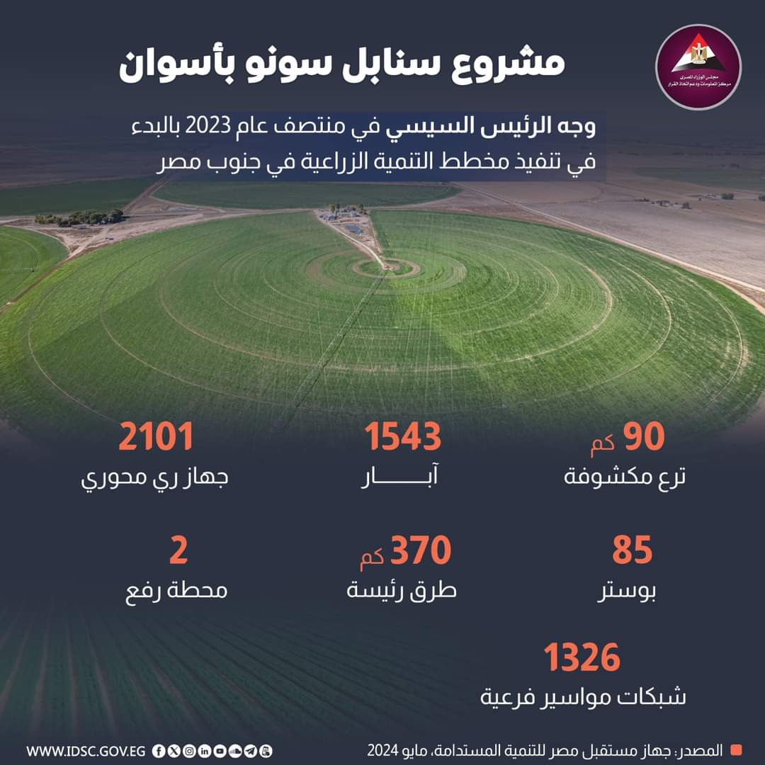 كشف مركز معلومات مجلس الوزراء عن تفاصيل المرحة الأولى مشروع سنابل سونو بأسوان.