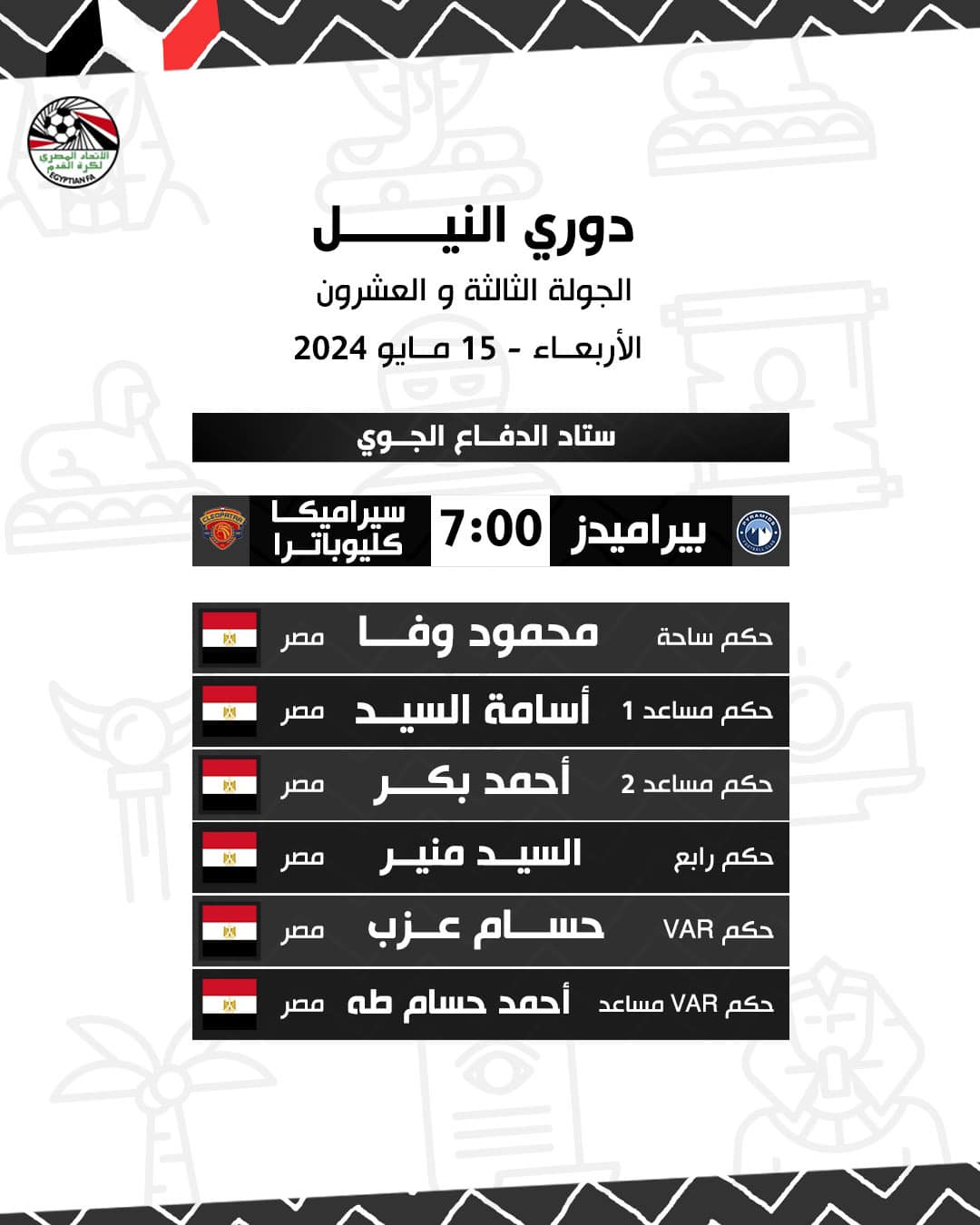 مباراة بيراميدز ضد سيراميكا كليوباترا تنطلق في السابعة مساء على إستاد الدفاع الجوي ويديرها محمود وفا عاشور حكمًا للساحة ويعاونه كلا من أحمد أسامة السيد مساعد أول وأحمد بكر مساعد ثاني والسيد منير حكمًا رابعًا وحسام عزب حكم فيديو وأحمد حسام طه حكم فيديو مساعد.